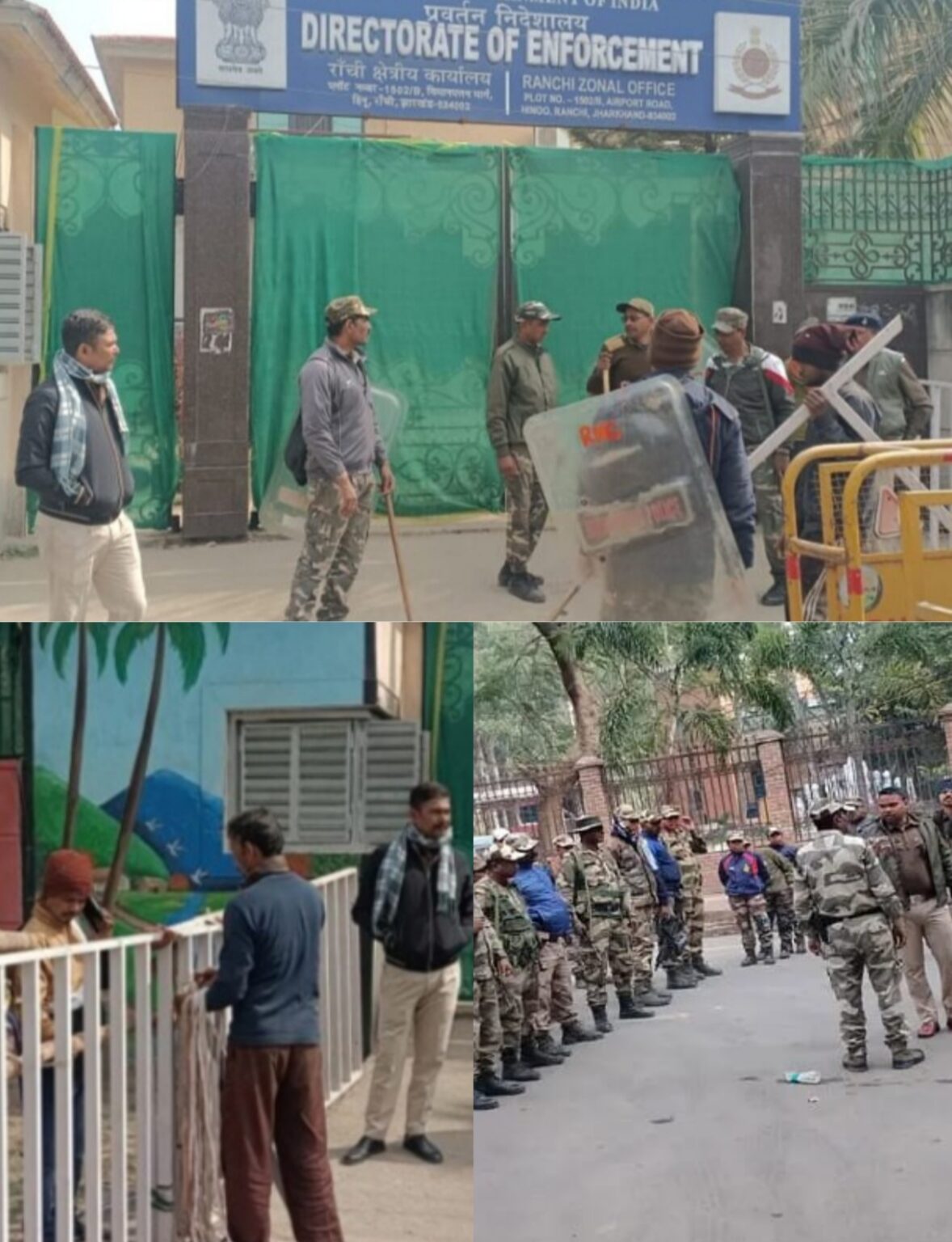 पुलिस मुख्यालय के निर्देश पर ईडी के क्षेत्रीय कार्यालय में अतिरिक्त पुलिस बल को तैनात किया गया है। ईडी कार्यालय को बैरिकेडिंग कर घेर दिया गया है।शुक्रवार को आदिवासी संगठनों ने ईडी द्वारा आदिवासी सरकार और आदिवासी मुख्यमंत्री को अस्थिर करने का प्रयास का आरोप लगाते हुए मोरहाबादी मैदान से राजभवन तक मार्च करेंगे और वहां धरना-प्रदर्शन करेंगे। इसे लेकर राजभवन से लेकर मोरहाबादी मैदान तक भी पुलिस बल की तैनाती की गई है।