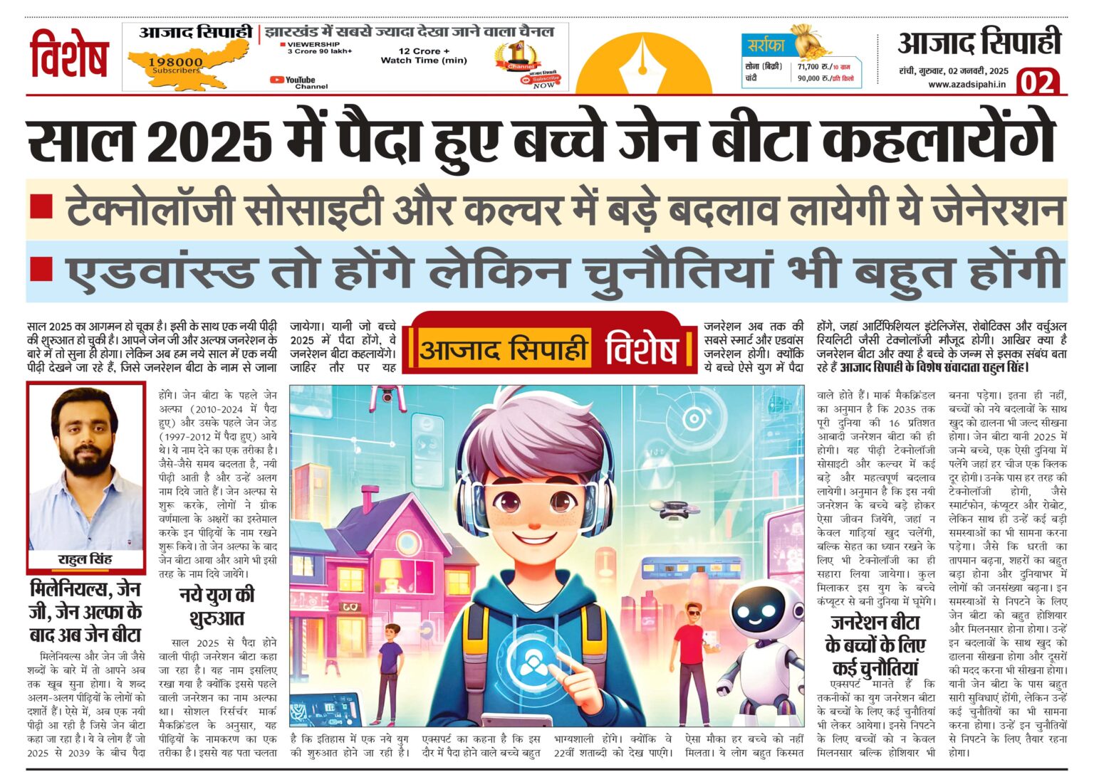 साल 2025 का आगमन हो चूका है। इसी के साथ एक नयी पीढ़ी की शुरूआत हो चुकी है। आपने जेन जी और अल्‍फा जनरेशन के बारे में तो सुना ही होगा। लेकिन अब हम नये साल में एक नयी पीढ़ी देखने जा रहे हैं, जिसे जनरेशन बीटा के नाम से जाना जायेगा। यानी जो बच्‍चे 2025 में पैदा होंगे, वे जनरेशन बीटा कहलायेंगे। जाहिर तौर पर यह जनरेशन अब तक की सबसे स्‍मार्ट और एडवांस जनरेशन होगी। क्‍योंकि ये बच्‍चे ऐसे युग में पैदा होंगे, जहां आर्टिफिशियल इंटेलिजेंस, रोबोटिक्स और वर्चुअल रियलिटी जैसी टेक्‍नोलॉजी मौजूद होगी। आखिर क्‍या है जनरेशन बीटा और क्‍या है बच्‍चे के जन्‍म से इसका संबंध बता रहे हैं आजाद सिपाही के विशेष संवादाता राहुल सिंह।