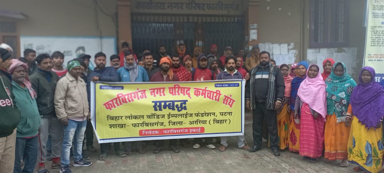 अररिया। फारबिसगंज नगर परिषद कर्मचारी संघ ने अपने पांच सूत्री मांगों को लेकर शनिवार को नगर परिषद कार्यालय परिसर में प्रदर्शन किया। नगर परिषद के कर्मचारियों ने पाने मांगों के समर्थन में जमकर नारेबाजी की।बिहार लोकल बॉडीज इम्प्लाइज फेडरेशन के राज्य संगठन मंत्री सूरज कुमार सोनू के नेतृत्व में सफाईकर्मियों ने प्रदर्शन किया।