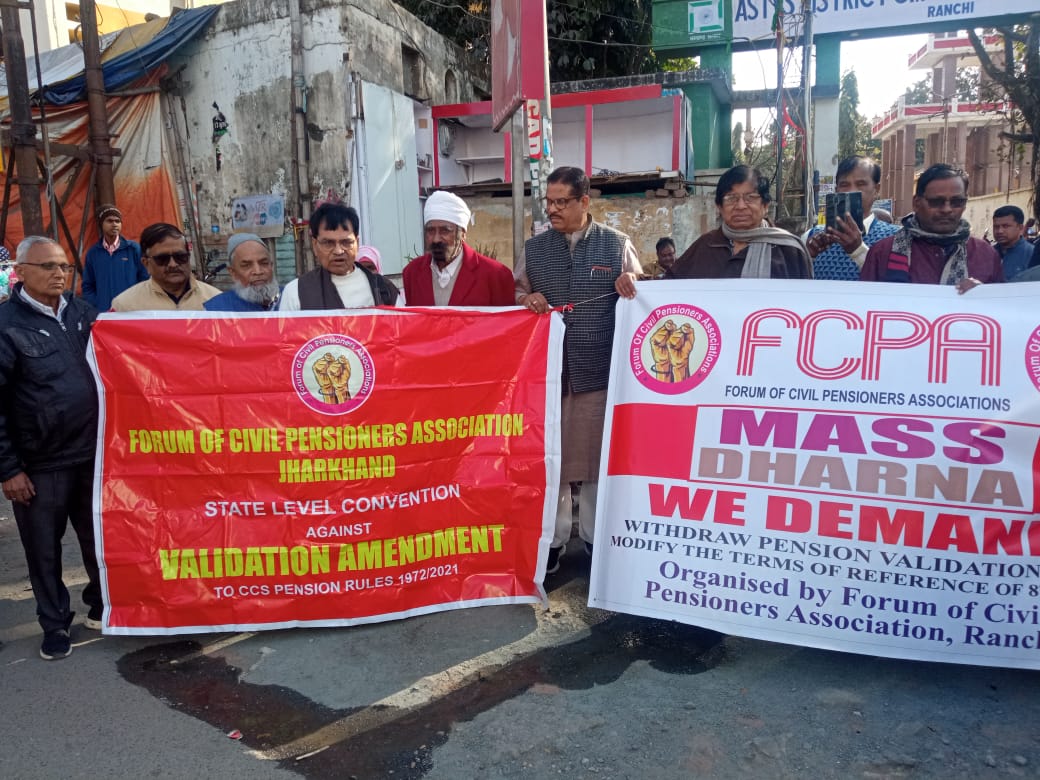 रांची। राष्ट्रीय आह्वान के तहत फोरम ऑफ सिविल पेंशनर्स एसोसिएशन, रांची के बैनर तले शनिवार को शहीद चौक, रांची में पेंशन अधिनियम में किए गए वैलिडेशन संशोधन और आठवें वेतन आयोग को भेजे गए टर्म ऑफ रेफरेंस के विरोध में जिला स्तरीय धरना का आयोजन किया गया। धरना में विभिन्न केंद्रीय विभागों के पेंशनर्स ने भाग लिया और सरकार के इस निर्णय के खिलाफ आवाज उठाई।