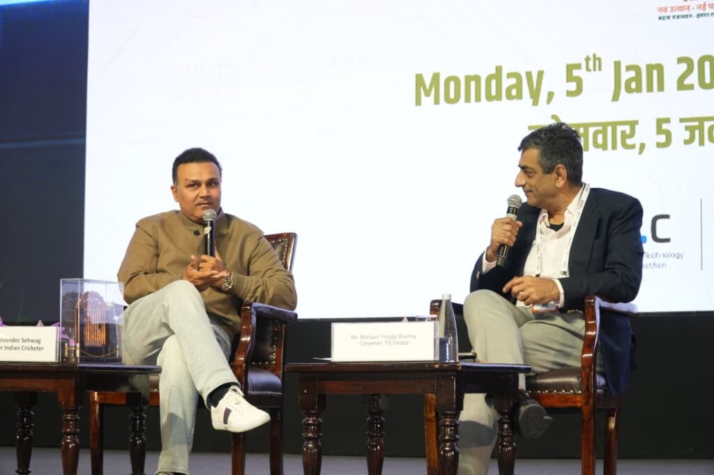 सहवाग सोमवार को सीतापुरा स्थित जयपुर एग्जीबिशन एंड कन्वेंशन सेंटर में आयोजित राजस्थान डिजिफेस्ट–टाई ग्लोबल समिट 2026 के दूसरे दिन टाई ग्लोबल के कन्वीनर महावीर प्रताप शर्मा से संवाद कर रहे थे। मुख्य हॉल में आयोजित इस फायरसाइड चैट में पूर्व भारतीय क्रिकेटर सहवाग का सत्र दर्शकों के लिए विशेष आकर्षण का केन्द्र रहा।