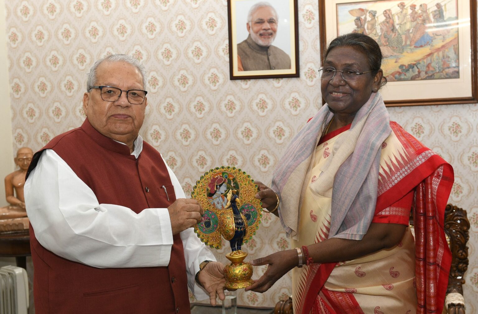 जयपुर। राज्यपाल कलराज मिश्र ने राष्ट्रपति द्रौपदी मुर्मू को बुधवार को राजभवन से लौटने पर भावभीनी विदाई दी। राज्यपाल मिश्र ने उन्हें मिनिएचर आर्ट की मयूर प्रतिमा भी स्मृति चिह्न स्वरूप भेंट की। राष्ट्रपति ने भी राज्यपाल का शॉल ओढ़ाकर अभिनंदन किया।