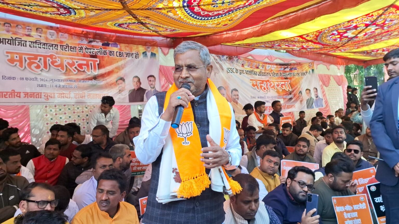 रांची। भाजयुमो की ओर से जेएसएससी प्रश्न लीक मामले को लेकर राजभवन के समीप एकदिवसीय धरना दिया गया। धरना में शामिल भाजपा प्रदेश अध्यक्ष बाबूलाल मरांडी ने कहा कि जेएसएससी की परीक्षा की तिथि घोषणा से 2-3 दिन पहले से ही 35 से 50 लाख तक में प्रश्न बेचा जा रहा था। अभ्यर्थियों की बात सुनकर मन में बेचैनी होती थी कि झारखंड में क्या हो रहा है।