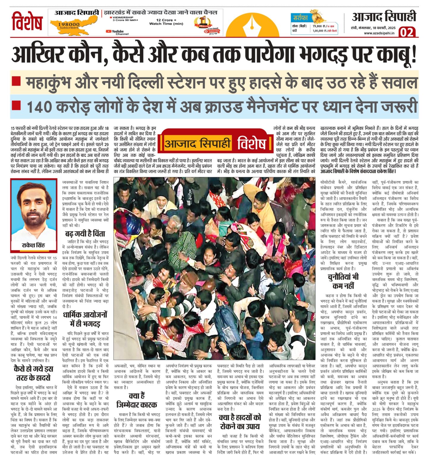 15 फरवरी को नयी दिल्ली रेलवे स्टेशन पर एक हादसा हुआ और 18 बेशकीमती जानें चली गयीं। भीड़ के कारण हुई भगदड़ का यह हादसा दुनिया के सबसे बड़े धार्मिक आयोजन महाकुंभ में जानेवाले तीर्थयात्रियों के साथ हुआ, जो ट्रेन पकड़ने आये थे। इससे पहले 29 जनवरी को महाकुंभ में भी इसी तरह का एक हादसा हुआ था, जिसमें कई लोगों की जान चली गयी थी। इन हादसों के बाद अब चारों तरफ से यह सवाल उठ रहा है कि आखिर कब और कैसे इस तरह की भगदड़ पर नियंत्रण पाया जा सकेगा। यह सही है कि हादसे को पूरी तरह रोकना संभव नहीं है, लेकिन उसकी आशंकाओं को कम तो किया ही जा सकता है। भगदड़ के इन हादसों ने साबित कर दिया है कि किसी भी सीमित स्थान पर असीमित संख्या में लोगों को जमा होने से रोकने के लिए अब तक कोई चाक-चौबंद व्यवस्था या मशीनरी का विकास नहीं हो पाया है। इसलिए भारत जैसे बड़ी आबादी वाले देश में अब क्राउड मैनेजमेंट, यानी भीड़ प्रबंधन का तंत्र विकसित किया जाना जरूरी हो गया है। प्रति वर्ग मीटर चार लोगों से कम की भीड़ घनत्व को आम तौर पर सुरक्षित सीमा माना जाता है। जैसे-जैसे यह प्रति वर्ग मीटर छह लोगों के करीब पहुंचता है, जोखिम काफी बढ़ जाता है। भारत के कई आयोजनों में इस सीमा को पार करने वाली भीड़ का होना आम बात है, खास तौर से धार्मिक आयोजनों में। भीड़ के घनत्व के अलावा परिधीय कारक भी तंग स्थिति को खतरनाक बनाने में भूमिका निभाते हैं। हाल के दिनों में भगदड़ जैसे जितने भी हादसे हुए हैं, उनमें एक बात कॉमन रही कि वहां की व्यवस्था पूरी तरह छिन्न-भिन्न हो गयी थी और अफवाहों को रोकने के लिए कुछ नहीं किया गया। नयी दिल्ली स्टेशन पर हुए हादसे के बाद जरूरी हो गया है कि भीड़ प्रबंधन के इन पहलुओं पर ध्यान दिया जाये और व्यवस्थापकों को इसका समुचित प्रशिक्षण दिया जाये। नयी दिल्ली रेलवे स्टेशन और महाकुंभ में हुए हादसे की पृष्ठभूमि में भगदड़ को रोकने के उपायों को रेखांकित कर रहे हैं आजाद सिपाही के विशेष संवाददाता राकेश सिंह।