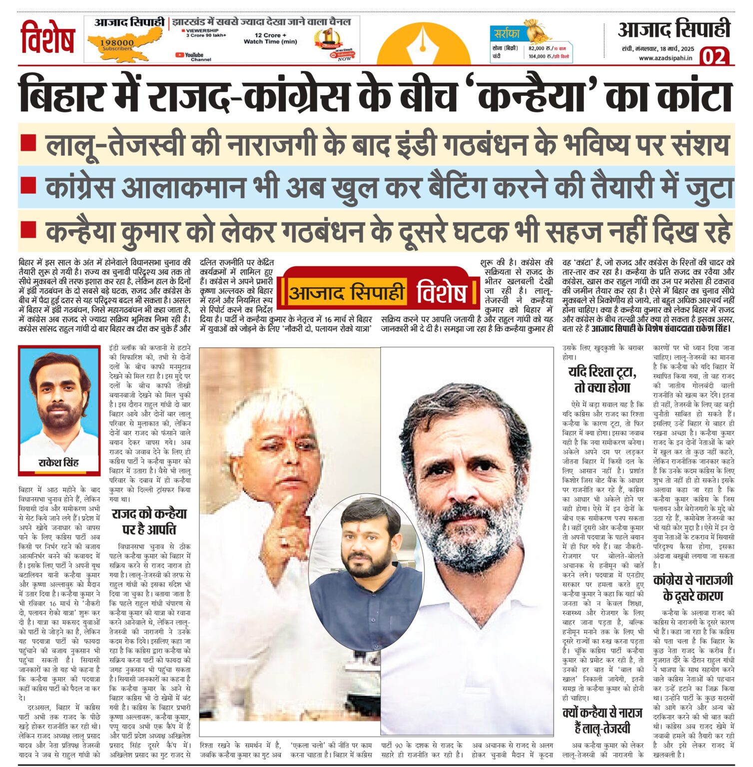 बिहार में इस साल के अंत में होनेवाले विधानसभा चुनाव की तैयारी शुरू हो गयी है। राज्य का चुनावी परिदृश्य अब तक तो सीधे मुकाबले की तरफ इशारा कर रहा है, लेकिन हाल के दिनों में इंडी गठबंधन के दो सबसे बड़े घटक, राजद और कांग्रेस के बीच में पैदा हुई दरार से यह परिदृश्य बदल भी सकता है। असल में बिहार में इंडी गठबंधन, जिसे महागठबंधन भी कहा जाता है, में कांग्रेस अब राजद से ज्यादा सक्रिय भूमिका निभा रही है। कांग्रेस सांसद राहुल गांधी दो बार बिहार का दौरा कर चुके हैं और दलित राजनीति पर केंद्रित कार्यक्रमों में शामिल हुए हैं। कांग्रेस ने अपने प्रभारी कृष्णा अल्लवरु को बिहार में रहने और नियमित रूप से रिपोर्ट करने का निर्देश दिया है। पार्टी ने कन्हैया कुमार के नेतृत्व में 16 मार्च से बिहार में युवाओं को जोड़ने के लिए ‘नौकरी दो, पलायन रोको यात्रा’ शुरू की है। कांग्रेस की सक्रियता से राजद के भीतर खलबली देखी जा रही है। लालू-तेजस्वी ने कन्हैया कुमार को बिहार में सक्रिय करने पर आपत्ति जतायी है और राहुल गांधी को यह जानकारी भी दे दी है। समझा जा रहा है कि कन्हैया कुमार ही वह ‘कांटा’ हैं, जो राजद और कांग्रेस के रिश्तों की चादर को तार-तार कर रहा है। कन्हैया के प्रति राजद का रवैया और कांग्रेस, खास कर राहुल गांधी का उन पर भरोसा ही टकराव की जमीन तैयार कर रहा है। ऐसे में बिहार का चुनाव सीधे मुकाबले से त्रिकोणीय हो जाये, तो बहुत अधिक आश्चर्य नहीं होना चाहिए। क्या है कन्हैया कुमार को लेकर बिहार में राजद और कांग्रेस के बीच तल्खी और क्या हो सकता है इसका असर, बता रहे हैं आजाद सिपाही के विशेष संवाददाता राकेश सिंह।