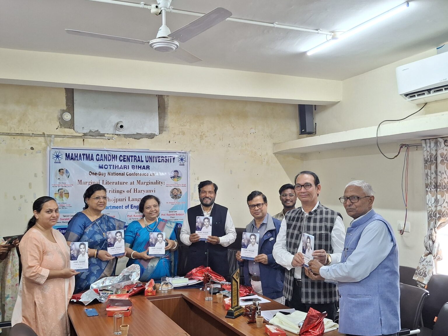 पूर्वी चंपारण। महात्मा गांधी केंद्रीय विश्वविद्यालय (एमजीसीयू) के अंग्रेज़ी विभाग द्वारा मार्जिनल साहित्य पर एक दिवसीय राष्ट्रीय सम्मेलन: हरियाणवी और भोजपुरी भाषा के लोक लेखन” का आयोजन किया गया। सम्मेलन में देशभर के प्रतिष्ठित साहित्यकारों, शिक्षाविदों और शोधकर्ताओं ने भाग लिया।सम्मेलन के उद्घाटन सत्र में दिल्ली विश्वविद्यालय के प्रो. उज्जवल जना, हरियाणा साहित्य अकादमी पुरस्कार विजेता प्रो. राजेंद्र बडगुजर, प्रसिद्ध भोजपुरी कवि डॉ. गोरख मस्ताना, मगध विश्वविद्यालय की प्रो. निभा सिंह, जेएनवी विश्वविद्यालय, जोधपुर की प्रो. कल्पना पुरोहित, और दिल्ली विश्वविद्यालय के पूर्व प्रोफेसर राजेंद्र गौतम शामिल थे।