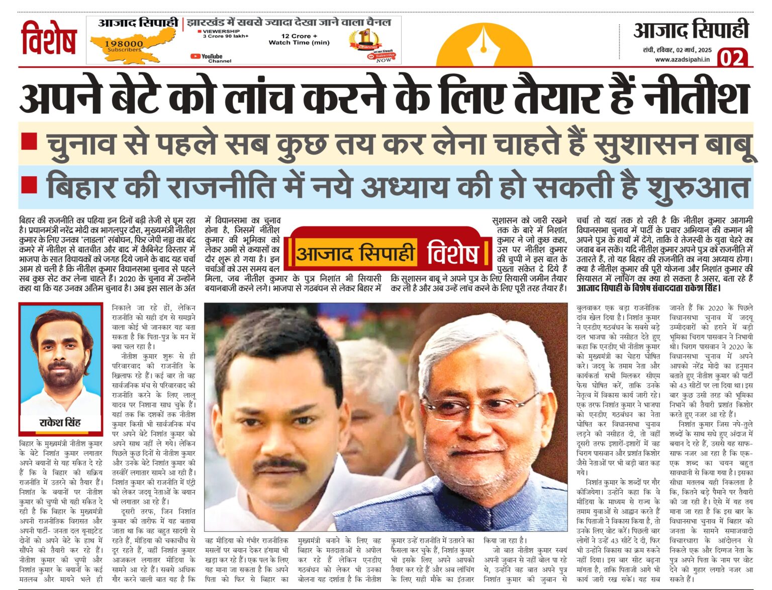 बिहार की राजनीति का पहिया इन दिनों बड़ी तेजी से घूम रहा है। प्रधानमंत्री नरेंद्र मोदी का भागलपुर दौरा, मुख्यमंत्री नीतीश कुमार के लिए उनका ‘लाडला’ संबोधन, फिर जेपी नड्डा का बंद कमरे में नीतीश से बातचीत और बाद में कैबिनेट विस्तार में भाजपा के सात विधायकों को जगह दिये जाने के बाद यह चर्चा आम हो चली है कि नीतीश कुमार विधानसभा चुनाव से पहले सब कुछ सेट कर लेना चाहते हैं। 2020 के चुनाव में उन्होंने कहा था कि यह उनका अंतिम चुनाव है। अब इस साल के अंत में विधानसभा का चुनाव होना है, जिसमें नीतीश कुमार की भूमिका को लेकर अभी से कयासों का दौर शुरू हो गया है। इन चर्चाओं को उस समय बल मिला, जब नीतीश कुमार के पुत्र निशांत भी सियासी बयानबाजी करने लगे। भाजपा से गठबंधन से लेकर बिहार में सुशासन को जारी रखने तक के बारे में निशांत कुमार ने जो कुछ कहा, उस पर नीतीश कुमार की चुप्पी ने इस बात के पुख्ता संकेत दे दिये हैं कि सुशासन बाबू ने अपने पुत्र के लिए सियासी जमीन तैयार कर ली है और अब उन्हें लांच करने के लिए पूरी तरह तैयार हैं। चर्चा तो यहां तक हो रही है कि नीतीश कुमार आगामी विधानसभा चुनाव में पार्टी के प्रचार अभियान की कमान भी अपने पुत्र के हाथों में देंगे, ताकि वे तेजस्वी के युवा चेहरे का जवाब बन सकें। यदि नीतीश कुमार अपने पुत्र को राजनीति में उतारते हैं, तो यह बिहार की राजनीति का नया अध्याय होगा। क्या है नीतीश कुमार की पूरी योजना और निशांत कुमार की सियासत में लांचिंग का क्या हो सकता है असर, बता रहे हैं आजाद सिपाही के विशेष संवाददाता राकेश सिंह।