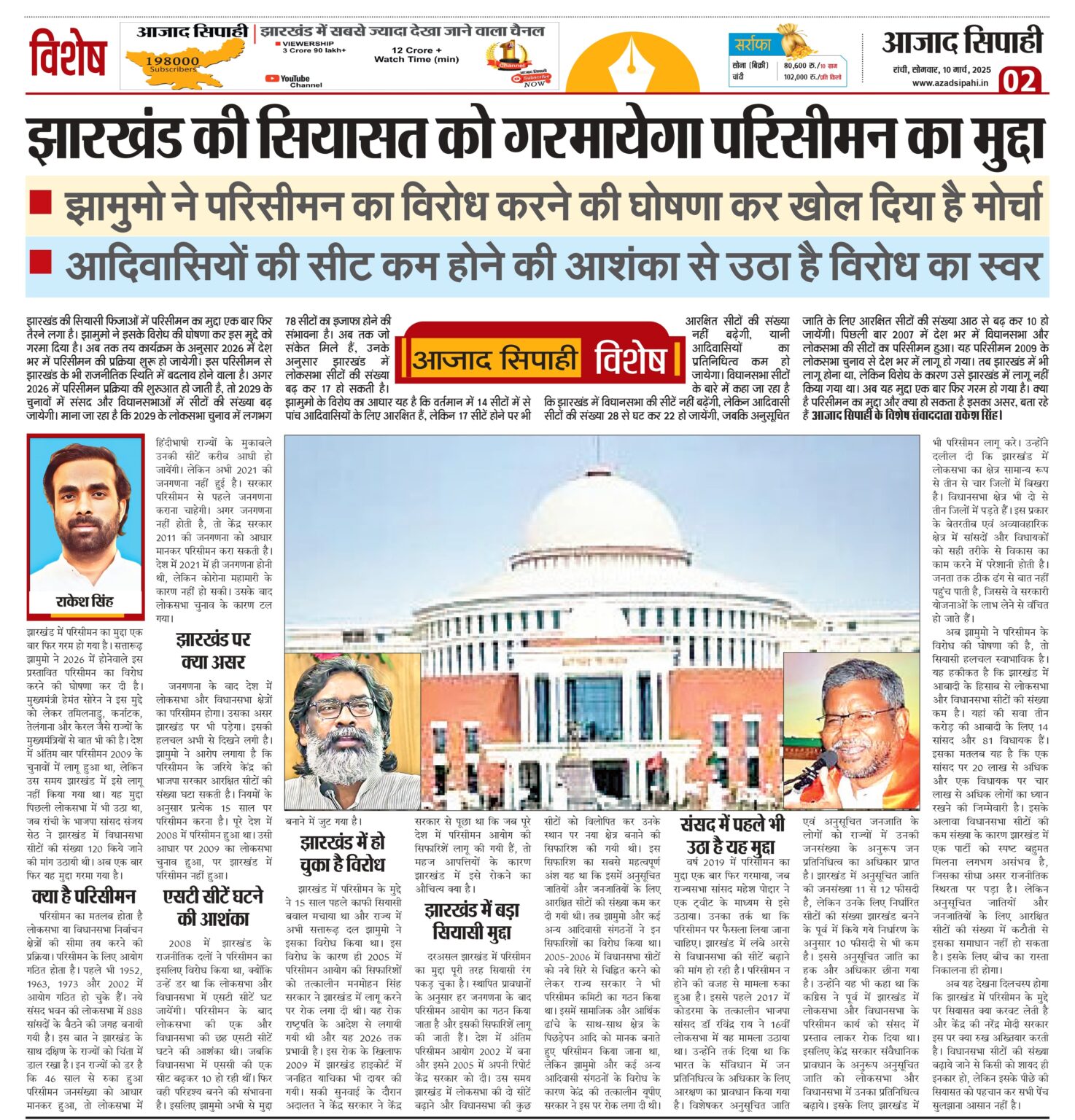 जनगणना के बाद देश में लोकसभा और विधानसभा क्षेत्रों का परिसीमन होगा। उसका असर झारखंड पर भी पड़ेगा। इसकी हलचल अभी से दिखने लगी है। झामुमो ने आरोप लगाया है कि परिसीमन के जरिये केंद्र की भाजपा सरकार आरक्षित सीटों की संख्या घटा सकती है। नियमों के अनुसार प्रत्येक 15 साल पर परिसीमन करना है। पूरे देश में 2008 में परिसीमन हुआ था। उसी आधार पर 2009 का लोकसभा चुनाव हुआ, पर झारखंड में परिसीमन नहीं हुआ।