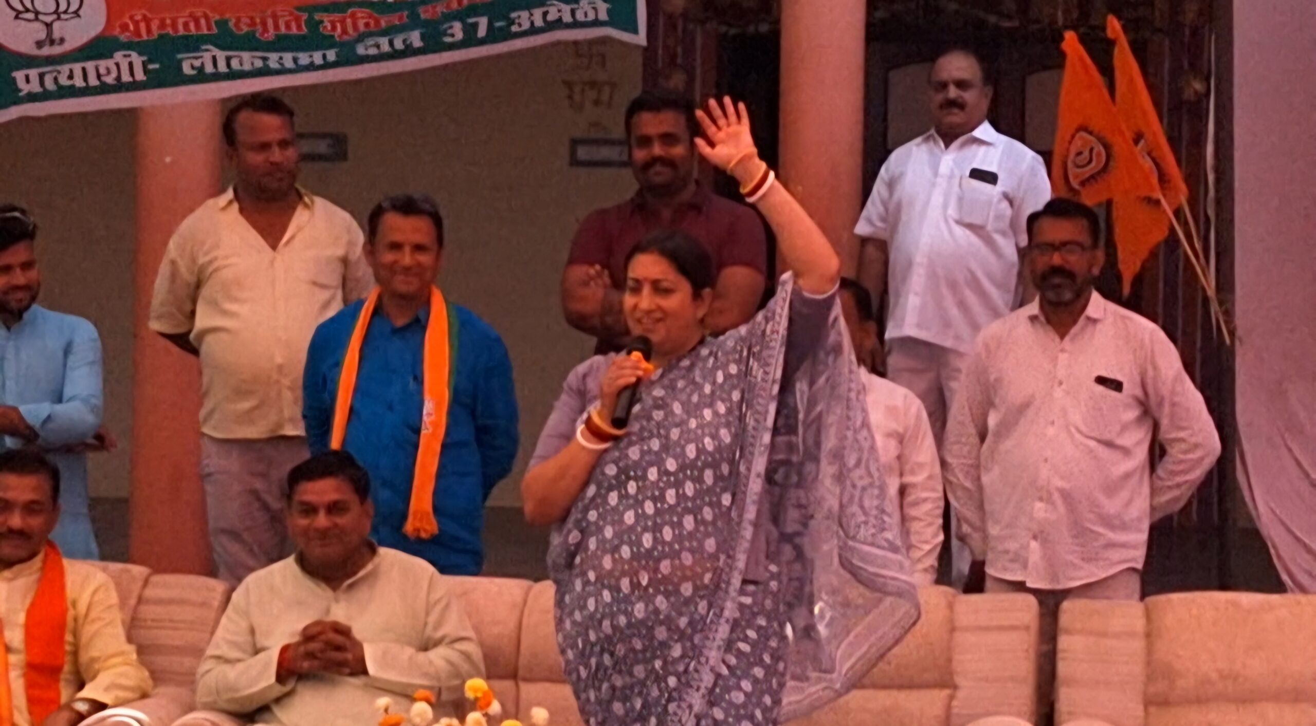 अमेठी। जनपद के थौरा गांव में सोमवार को पहुंची केंद्रीय मंत्री स्मृति ईरानी ने भारत माता की जय उद्घोष से अपना संबोधन शुरू किया। उन्होंने वहां पर मौजूद लोगों से कहा कि इतनी तेज आवाज में भारत मां की जय बोलना है कि यह गूंज वायनाड तक जाए।