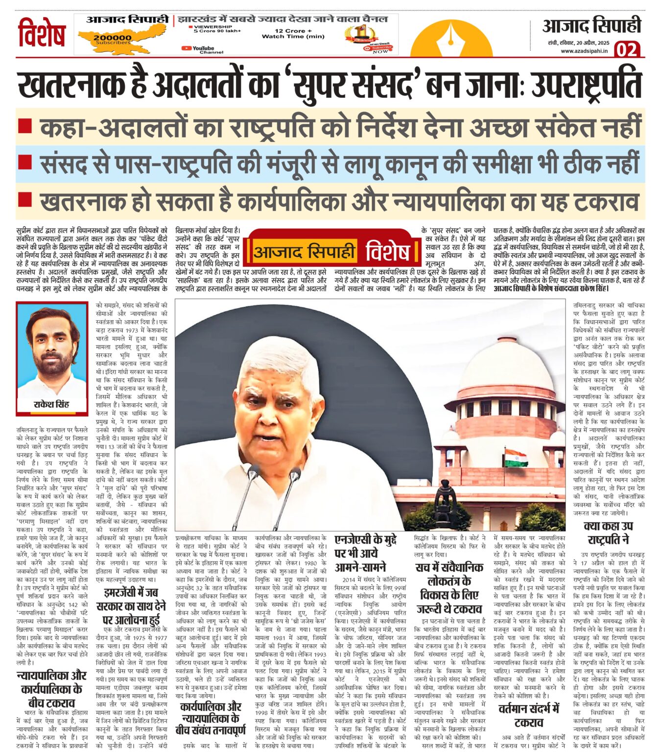 सुप्रीम कोर्ट द्वारा हाल में विधानसभाओं द्वारा पारित विधेयकों को संबंधित राज्यपालों द्वारा अनंत काल तक रोक कर ‘पॉकेट वीटो करने की प्रवृत्ति के खिलाफ सुप्रीम कोर्ट की दो सदस्यीय खंडपीठ ने जो निर्णय दिया है, उससे विधायिका में भारी कसमसाहट है। वे कह रहे हैं यह कार्यपालिका के क्षेत्र में न्यायपालिका का अनावश्यक हस्तक्षेप है। अदालतें कार्यपालिक प्रमुखों, जैसे राष्ट्रपति और राज्यपालों को निर्देशित कैसे कर सकती हैं। उप राष्ट्रपति जगदीप धनखड़ ने इस मुद्दे को लेकर सुप्रीम कोर्ट और न्यायपालिका के खिलाफ मोर्चा खोल दिया है। उन्होंने कहा कि कोर्ट ‘सुपर संसद’ की तरह काम न करे। उप राष्ट्रपति के इस तेवर पर भी विधि विशेषज्ञ दो खेमों में बंट गये हैं। एक इस पर आपत्ति जता रहा है, तो दूसरा इसे ‘साहसिक’ बता रहा है। इसके अलावा संसद द्वारा पारित और राष्ट्रपति द्वारा हस्ताक्षरित कानून पर स्थगनादेश देना भी अदालतों के ‘सुपर संसद’ बन जाने का संकेत हैं। ऐसे में यह सवाल उठ रहा है कि क्या अब संविधान के दो मूलभूत अंग, न्यायपालिका और कार्यपालिका ही एक दूसरे के खिलाफ खड़े हो गये हैं और क्या यह स्थिति हमारे लोकतंत्र के लिए सुखकर है। इन दोनों सवालों का जवाब ‘नहीं’ है। यह स्थिति लोकतंत्र के लिए घातक है, क्योंकि वैचारिक द्वंद्व होना अलग बात है और अधिकारों का अतिक्रमण और मर्यादा के सीमांकन की जिद होना दूसरी बात। इस द्वंद्व में कार्यपालिका, विधायिका से समर्थन चाहेगी, जो हो भी रहा है, क्योंकि स्वतंत्र और प्रभावी न्यायपालिका, जो आज खुद सवालों के घेरे में है, अक्सर कार्यपालिका के कान उमेठती रहती है और कभी-कभार विधायिका को भी निर्देशित करती है। क्या है इस टकराव के मायने और लोकतंत्र के लिए यह रवैया कितना घातक है, बता रहे हैं आजाद सिपाही के विशेष संवाददाता राकेश सिंह।