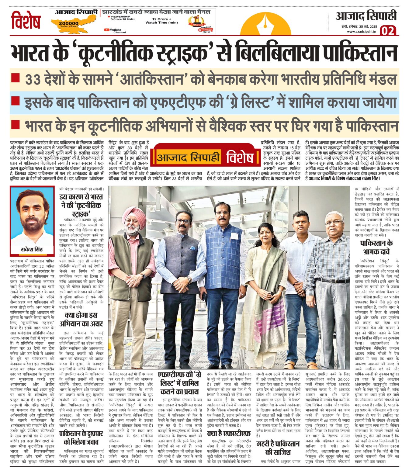 पहलगाम में बर्बर नरसंहार के बाद पाकिस्तान के खिलाफ आर्थिक और सैन्य स्ट्राइक कर भारत ने ‘आतंकिस्तान’ की कमर पहले ही तोड़ दी है, लेकिन अभी उसकी दुर्गति बाकी है। इसलिए भारत ने पाकिस्तान के खिलाफ ‘कूटनीतिक स्ट्राइक’ की है, जिसके पहले ही प्रहार से पाकिस्तान बिलबिलाने लगा है। भारत सरकार ने एक अहम कूटनीतिक पहल के तहत ‘आउटरीच प्रोग्राम’ की शुरूआत की है, जिसका उद्देश्य पाकिस्तान में पल रहे आतंकवाद के बारे में दुनिया भर के देशों को जानकारी देना है। यह अभियान ‘ऑपरेशन सिंदूर’ के बाद शुरू हुआ है और कुल 33 देशों में भारतीय प्रतिनिधि मंडल पहुंच गया है। इन प्रतिनिधि मंडलों में देश की अलग-अलग पार्टियों के वरिष्ठ नेता शामिल किये गये हैं और ये आतंकवाद के मुद्दे पर भारत का पक्ष वैश्विक मंचों पर मजबूती से रखेंगे। जिन 33 देशों में भारतीय प्रतिनिधि मंडल गया है, उनमें से लगभग 15 देश संयुक्त राष्ट्र सुरक्षा परिषद के सदस्य हैं। इनमें पांच स्थायी सदस्य और 10 अस्थायी सदस्य शामिल हैं, जो हर दो साल में बदलते रहते हैं। इसके अलावा पांच और देश ऐसे हैं, जो आने वाले समय में सुरक्षा परिषद के सदस्य बनने वाले हैं। इसके अलावा कुछ अन्य देशों को भी चुना गया है, जिनकी आवाज वैश्विक मंच पर महत्वपूर्ण मानी जाती है। इस महत्वपूर्ण कूटनीतिक अभियान के बाद पाकिस्तान को वैश्विक एजेंसी फाइनेंशियल एक्शन टास्क फोर्स, यानी एफएटीएफ की ‘ग्रे लिस्ट’ में शामिल करने का अभियान शुरू होगा, ताकि आतंक की फैक्ट्री को वैश्विक स्तर पर आर्थिक मदद से वंचित किया जा सके। पाकिस्तान के खिलाफ क्या है भारत का कूटनीतिक प्लान और क्या होगा इसका असर, बता रहे हैं आजाद सिपाही के विशेष संवाददाता राकेश सिंह।