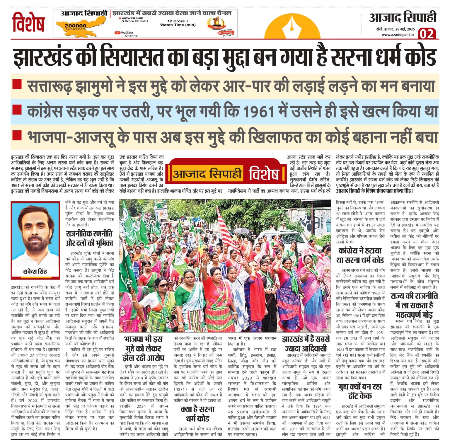 झारखंड की राजनीति के केंद्र में इन दिनों सरना धर्म कोड का मुद्दा छाया हुआ है। राज्य में सरना धर्म कोड की मांग लंबे समय से चली आ रही है, जो अब राज्य की राजनीति की धुरी बनती जा रही है। यह मुद्दा न केवल आदिवासी समुदाय की सांस्कृतिक और धार्मिक पहचान से जुड़ा है, बल्कि यह एक बड़े वोट बैंक को प्रभावित करने वाला राजनीतिक हथियार भी बन गया है। झारखंड की लगभग 27 प्रतिशत आबादी आदिवासियों की है, जो मुख्य रूप से खुद को सरना धर्म के तहत मानती है। यह प्रकृति पूजा पर आधारित है और इसे मानने वाले संताली, मुंडा, हो, और कुड़ुख समेत अन्य समुदाय पेड़, पहाड़, नदियों और जंगलों की पूजा करते हैं। वर्ष 2020 में झारखंड विधानसभा ने सर्वसम्मति से सरना आदिवासी धर्म कोड को जनगणना में शामिल करने का प्रस्ताव पारित किया था, जिसे केंद्र सरकार को मंजूरी के लिए भेजा गया। केंद्र द्वारा इस पर कोई ठोस निर्णय न लेने से यह मुद्दा और गर्म हो गया है और राज्य में सत्तारूढ़ झारखंड मुक्ति मोर्चा के नेतृत्व वाला गठबंधन इसे लेकर राजनीतिक तौर पर हावी है।