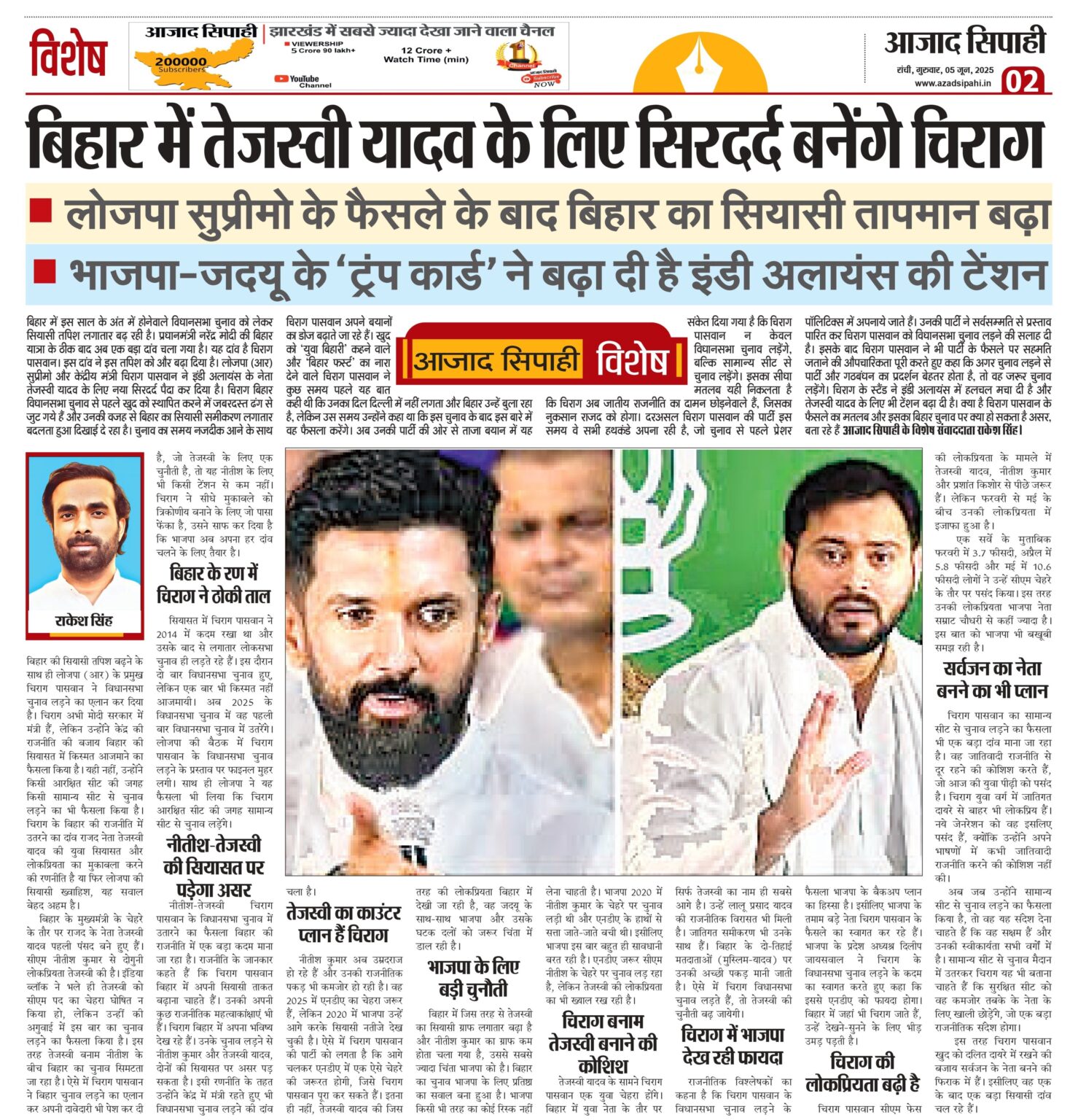 बिहार में इस साल के अंत में होनेवाले विधानसभा चुनाव को लेकर सियासी तपिश लगातार बढ़ रही है। प्रधानमंत्री नरेंद्र मोदी की बिहार यात्रा के ठीक बाद अब एक बड़ा दांव चला गया है। यह दांव है चिराग पासवान। इस दांव ने इस तपिश को और बढ़ा दिया है। लोजपा (आर) सुप्रीमो और केंद्रीय मंत्री चिराग पासवान ने इंडी अलायंस के नेता तेजस्वी यादव के लिए नया सिरदर्द पैदा कर दिया है। चिराग बिहार विधानसभा चुनाव से पहले खुद को स्थापित करने में जबरदस्त ढंग से जुट गये हैं और उनकी वजह से बिहार का सियासी समीकरण लगातार बदलता हुआ दिखाई दे रहा है। चुनाव का समय नजदीक आने के साथ चिराग पासवान अपने बयानों का डोज बढ़ाते जा रहे हैं। खुद को ‘युवा बिहारी’ कहने वाले और ‘बिहार फर्स्ट’ का नारा देने वाले चिराग पासवान ने कुछ समय पहले यह बात कही थी कि उनका दिल दिल्ली में नहीं लगता और बिहार उन्हें बुला रहा है, लेकिन उस समय उन्होंने कहा था कि इस चुनाव के बाद इस बारे में वह फैसला करेंगे। अब उनकी पार्टी की ओर से ताजा बयान में यह संकेत दिया गया है कि चिराग पासवान न केवल विधानसभा चुनाव लड़ेंगे, बल्कि सामान्य सीट से चुनाव लड़ेंगे। इसका सीधा मतलब यही निकलता है कि चिराग अब जातीय राजनीति का दामन छोड़नेवाले हैं, जिसका नुकसान राजद को होगा। दरअसल चिराग पासवान की पार्टी इस समय वे सभी हथकंडे अपना रही है, जो चुनाव से पहले प्रेशर पॉलिटिक्स में अपनाये जाते हैं। उनकी पार्टी ने सर्वसम्मति से प्रस्ताव पारित कर चिराग पासवान को विधानसभा चुनाव लड़ने की सलाह दी है। इसके बाद चिराग पासवान ने भी पार्टी के फैसले पर सहमति जताने की औपचारिकता पूरी करते हुए कहा कि अगर चुनाव लड़ने से पार्टी और गठबंधन का प्रदर्शन बेहतर होता है, तो वह जरूर चुनाव लड़ेंगे। चिराग के स्टैंड ने इंडी अलायंस में हलचल मचा दी है और तेजस्वी यादव के लिए भी टेंशन बढ़ा दी है। क्या है चिराग पासवान के फैसले का मतलब और इसका बिहार चुनाव पर क्या हो सकता है असर, बता रहे हैं आजाद सिपाही के विशेष संवाददाता राकेश सिंह।