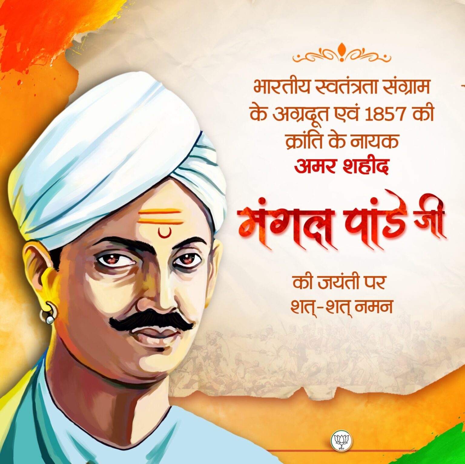 नई दिल्ली। भारतीय जनता पार्टी (भाजपा) ने देश के प्रथम स्वाधीनता संग्राम में महत्वपूर्ण भूमिका निभाने वाले अमर शहीद मंगल पांडे को उनकी जयंती पर याद करते हुए नमन किया है। भाजपा ने एक्स पर लिखा, ”भारतीय स्वतंत्रता संग्राम के अग्रदूत एवं 1857 की क्रांति के नायक अमर शहीद मंगल पांडे जी की जयंती पर कोटि-कोटि नमन।”