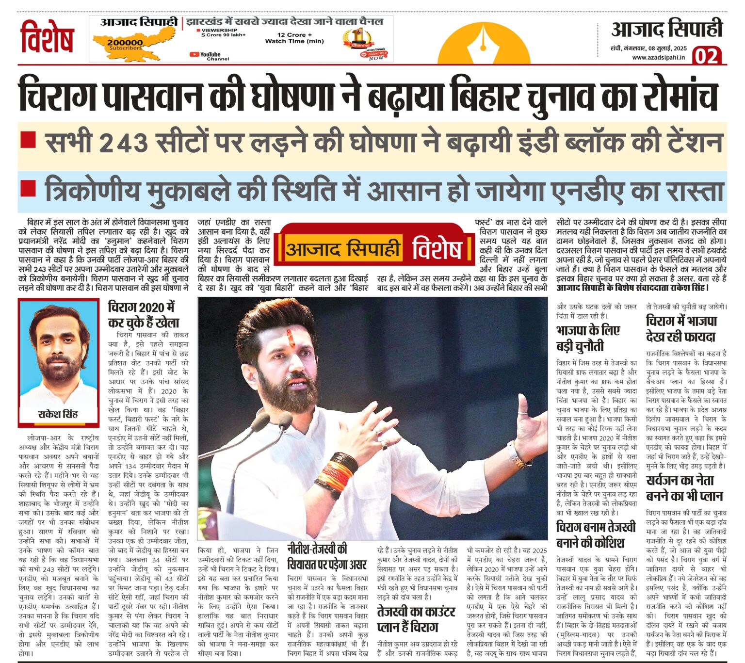 बिहार में इस साल के अंत में होनेवाले विधानसभा चुनाव को लेकर सियासी तपिश लगातार बढ़ रही है। खुद को प्रधानमंत्री नरेंद्र मोदी का ‘हनुमान’ कहनेवाले चिराग पासवान की घोषणा ने इस तपिश को बढ़ा दिया है। चिराग पासवान ने कहा है कि उनकी पार्टी लोजपा-आर बिहार की सभी 243 सीटों पर अपना उम्मीदवार उतारेगी और मुकाबले को त्रिकोणीय बनायेगी। चिराग पासवान ने खुद भी चुनाव लड़ने की घोषणा कर दी है। चिराग पासवान की इस घोषणा ने जहां एनडीए का रास्ता आसान बना दिया है, वहीं इंडी अलायंस के लिए नया सिरदर्द पैदा कर दिया है। चिराग पासवान की घोषणा के बाद से बिहार का सियासी समीकरण लगातार बदलता हुआ दिखाई दे रहा है। खुद को ‘युवा बिहारी’ कहने वाले और ‘बिहार फर्स्ट’ का नारा देने वाले चिराग पासवान ने कुछ समय पहले यह बात कही थी कि उनका दिल दिल्ली में नहीं लगता और बिहार उन्हें बुला रहा है, लेकिन उस समय उन्होंने कहा था कि इस चुनाव के बाद इस बारे में वह फैसला करेंगे। अब उन्होंने बिहार की सभी सीटों पर उम्मीदवार देने की घोषणा कर दी है। इसका सीधा मतलब यही निकलता है कि चिराग अब जातीय राजनीति का दामन छोड़नेवाले हैं, जिसका नुकसान राजद को होगा। दरअसल चिराग पासवान की पार्टी इस समय वे सभी हथकंडे अपना रही है, जो चुनाव से पहले प्रेशर पॉलिटिक्स में अपनाये जाते हैं। क्या है चिराग पासवान के फैसले का मतलब और इसका बिहार चुनाव पर क्या हो सकता है असर, बता रहे हैं आजाद सिपाही के विशेष संवाददाता राकेश सिंह।