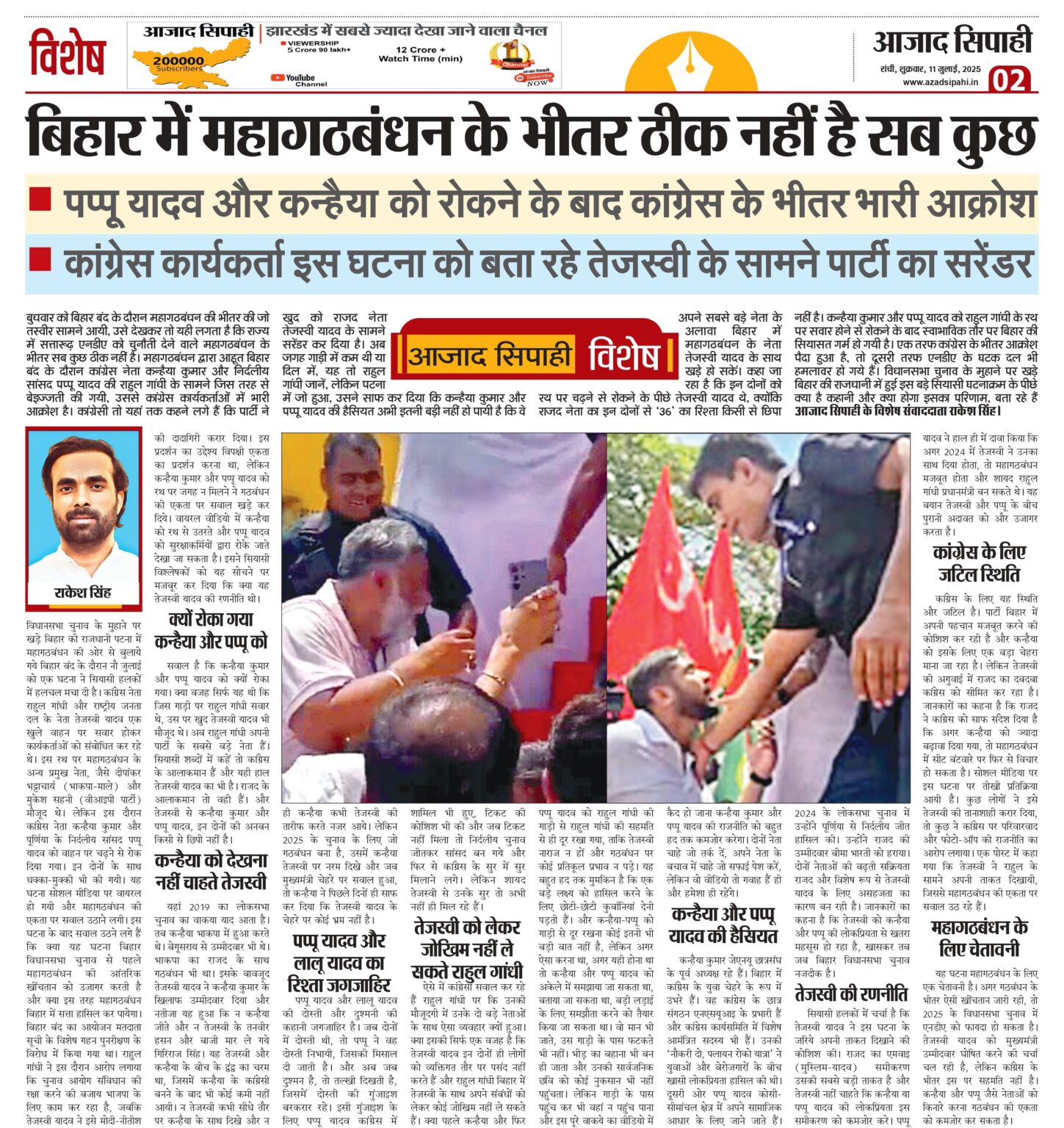 बुधवार को बिहार बंद के दौरान महागठबंधन की भीतर की जो तस्वीर सामने आयी, उसे देखकर तो यही लगता है कि राज्य में सत्तारूढ़ एनडीए को चुनौती देने वाले महागठबंधन के भीतर सब कुछ ठीक नहीं है। महागठबंधन द्वारा आहूत बिहार बंद के दौरान कांग्रेस नेता कन्हैया कुमार और निर्दलीय सांसद पप्पू यादव की राहुल गांधी के सामने जिस तरह से बेइज्जती की गयी, उससे कांग्रेस कार्यकर्ताओं में भारी आक्रोश है। कांग्रेसी तो यहां तक कहने लगे हैं कि पार्टी ने खुद को राजद नेता तेजस्वी यादव के सामने सरेंडर कर दिया है। अब जगह गाड़ी में कम थी या दिल में, यह तो राहुल गांधी जानें, लेकिन पटना में जो हुआ, उसने साफ कर दिया कि कन्हैया कुमार और पप्पू यादव की हैसियत अभी इतनी बड़ी नहीं हो पायी है कि वे अपने सबसे बड़े नेता के अलावा बिहार में महागठबंधन के नेता तेजस्वी यादव के साथ खड़े हो सकें। कहा जा रहा है कि इन दोनों को रथ पर चढ़ने से रोकने के पीछे तेजस्वी यादव थे, क्योंकि राजद नेता का इन दोनों से ‘36’ का रिश्ता किसी से छिपा नहीं है। कन्हैया कुमार और पप्पू यादव को राहुल गांधी के रथ पर सवार होने से रोकने के बाद स्वाभाविक तौर पर बिहार की सियासत गर्म हो गयी है। एक तरफ कांग्रेस के भीतर आक्रोश पैदा हुआ है, तो दूसरी तरफ एनडीए के घटक दल भी हमलावर हो गये हैं। विधानसभा चुनाव के मुहाने पर खड़े बिहार की राजधानी में हुई इस बड़े सियासी घटनाक्रम के पीछे क्या है कहानी और क्या होगा इसका परिणाम, बता रहे हैं आजाद सिपाही के विशेष संवाददाता राकेश सिंह।
