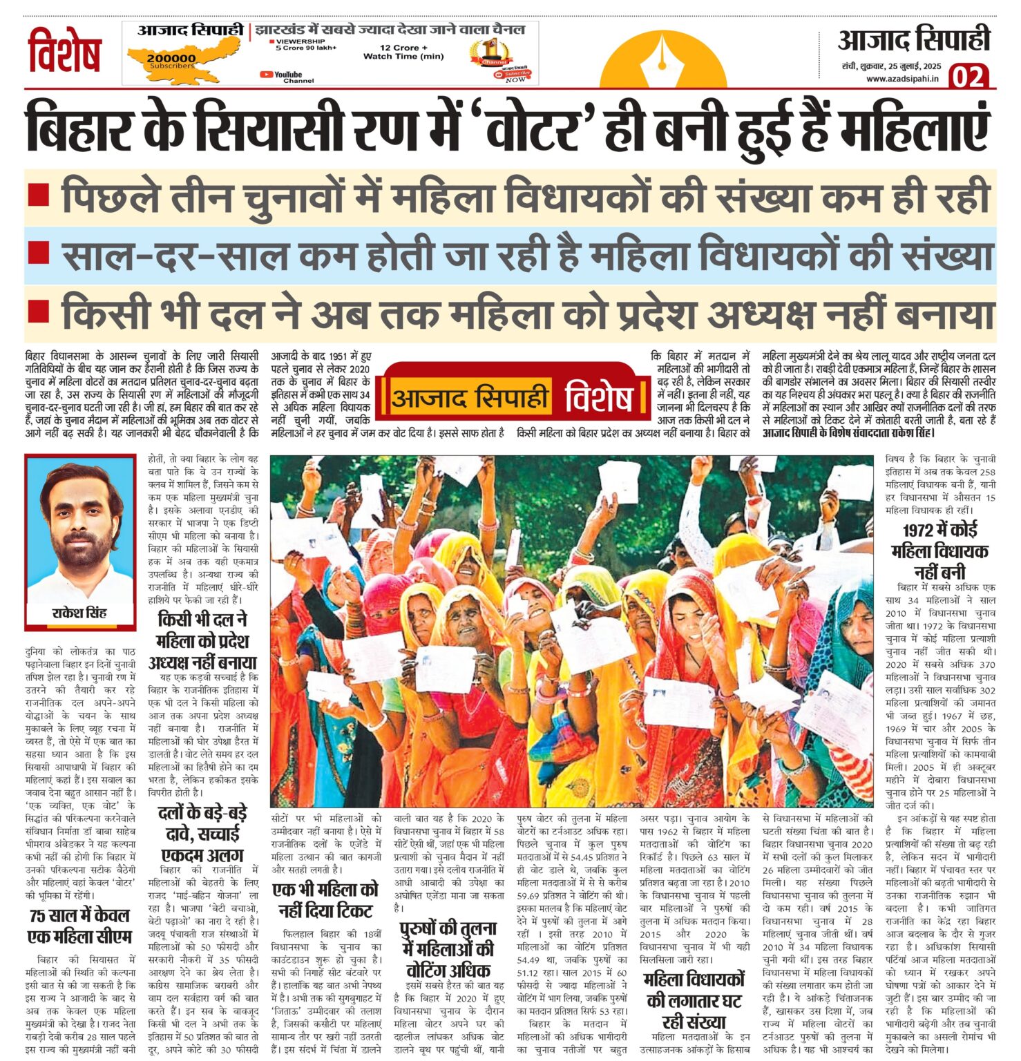 बिहार विधानसभा के आसन्न चुनावों के लिए जारी सियासी गतिविधियों के बीच यह जान कर हैरानी होती है कि जिस राज्य के चुनाव में महिला वोटरों का मतदान प्रतिशत चुनाव-दर-चुनाव बढ़ता जा रहा है, उस राज्य के सियासी रण में महिलाओं की मौजूदगी चुनाव-दर-चुनाव घटती जा रही है। जी हां, हम बिहार की बात कर रहे हैं, जहां के चुनाव मैदान में महिलाओं की भूमिका अब तक वोटर से आगे नहीं बढ़ सकी है। यह जानकारी भी बेहद चौंकानेवाली है कि आजादी के बाद 1951 में हुए पहले चुनाव से लेकर 2020 तक के चुनाव में बिहार के इतिहास में कभी एक साथ 34 से अधिक महिला विधायक नहीं चुनी गयीं, जबकि महिलाओं ने हर चुनाव में जम कर वोट दिया है। इससे साफ होता है कि बिहार में मतदान में महिलाओं की भागीदारी तो बढ़ रही है, लेकिन सरकार में नहीं। इतना ही नहीं, यह जानना भी दिलचस्प है कि आज तक किसी भी दल ने किसी महिला को बिहार प्रदेश का अध्यक्ष नहीं बनाया है। बिहार को महिला मुख्यमंत्री देने का श्रेय लालू यादव और राष्ट्रीय जनता दल को ही जाता है। राबड़ी देवी एकमात्र महिला हैं, जिन्हें बिहार के शासन की बागडोर संभालने का अवसर मिला। बिहार की सियासी तस्वीर का यह निश्चय ही अंधकार भरा पहलू है। क्या है बिहार की राजनीति में महिलाओं का स्थान और आखिर क्यों राजनीतिक दलों की तरफ से महिलाओं को टिकट देने में कोताही बरती जाती है, बता रहे हैं आजाद सिपाही के विशेष संवाददाता राकेश सिंह।