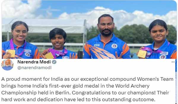 प्रधानमंत्री ने ट्वीट किया, “भारत के लिए यह गर्व का क्षण है क्योंकि हमारी असाधारण कंपाउंड महिला टीम ने बर्लिन में आयोजित विश्व तीरंदाजी चैंपियनशिप में भारत को पहला स्वर्ण पदक दिलाया। हमारे चैंपियंस को बधाई! उनकी कड़ी मेहनत और समर्पण के कारण यह उत्कृष्ट परिणाम आया है।”