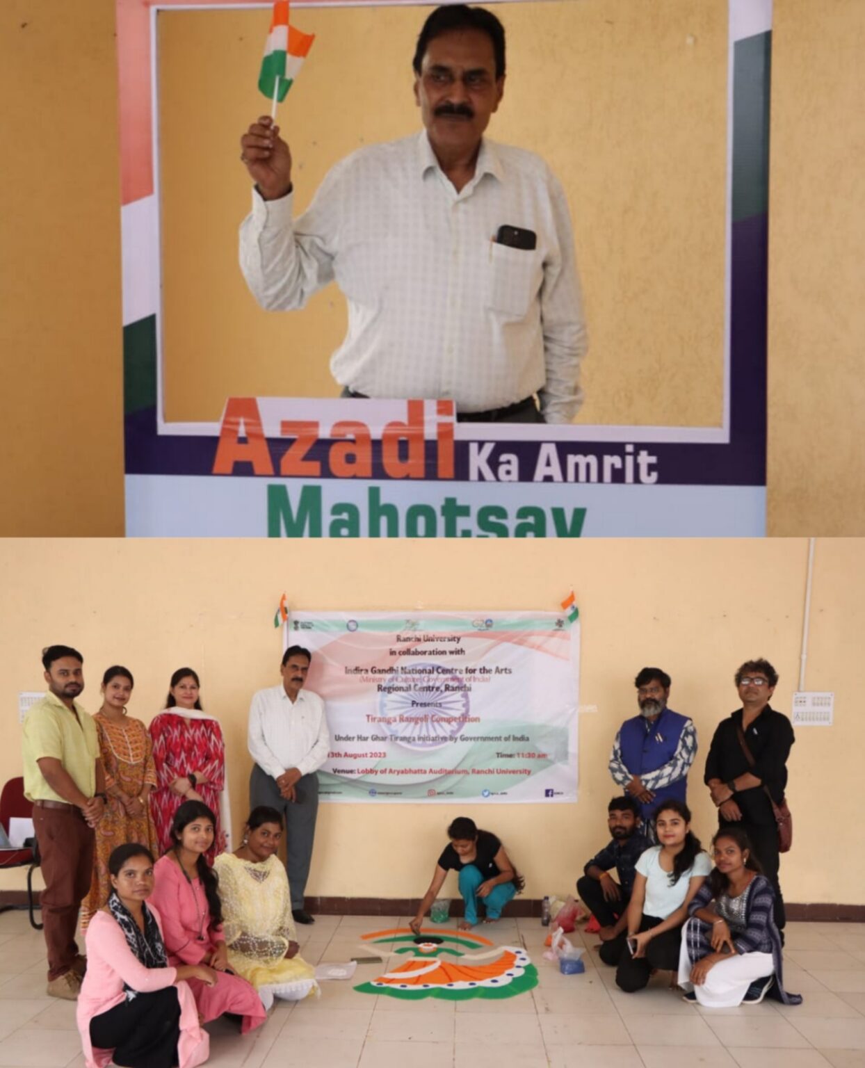 कुलपति ने कलाकार छात्रों संग तस्वीरें भी खिंचवाई। प्रतियोगिता में रांची विश्वविद्यालय के परफॉर्मिंग एंड फाइन आर्ट विभाग के छात्रों ने सक्रिय रूप से भाग लिया और अपनी रंगोली में देशभक्ति की जीवंत कला को चित्रित किया। प्रतियोगिता के निर्णायक रांची के वरिष्ठ कलाकार प्रवीण कर्मकार थे।