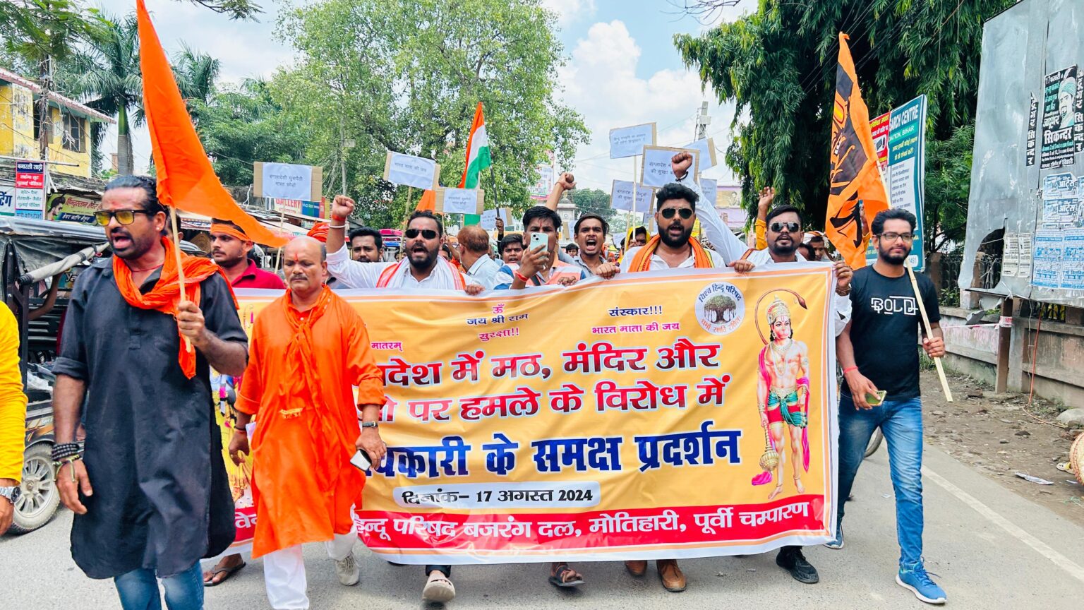 पूर्वी चंपारण। बांग्लादेश मे हिन्दुओ और मठ मंदिरो पर हो रहे हमले के विरोध मे शनिवार को विहिप और बजरंग दल ने विशाल जूलूस निकाल कर प्रदर्शन किया। जूलूस मोतिहारी शहर के ज्ञानबाबू चौक से शुरू हुआ जो मेन रोड होते हुए हॉस्पिटल चौक बलुआ चौक व राज बाजार होते जिला समाहरणालय पहुंचा,जहां जिलाधिकारी के समक्ष जमकर प्रदर्शन कर सभा भी किया गया।