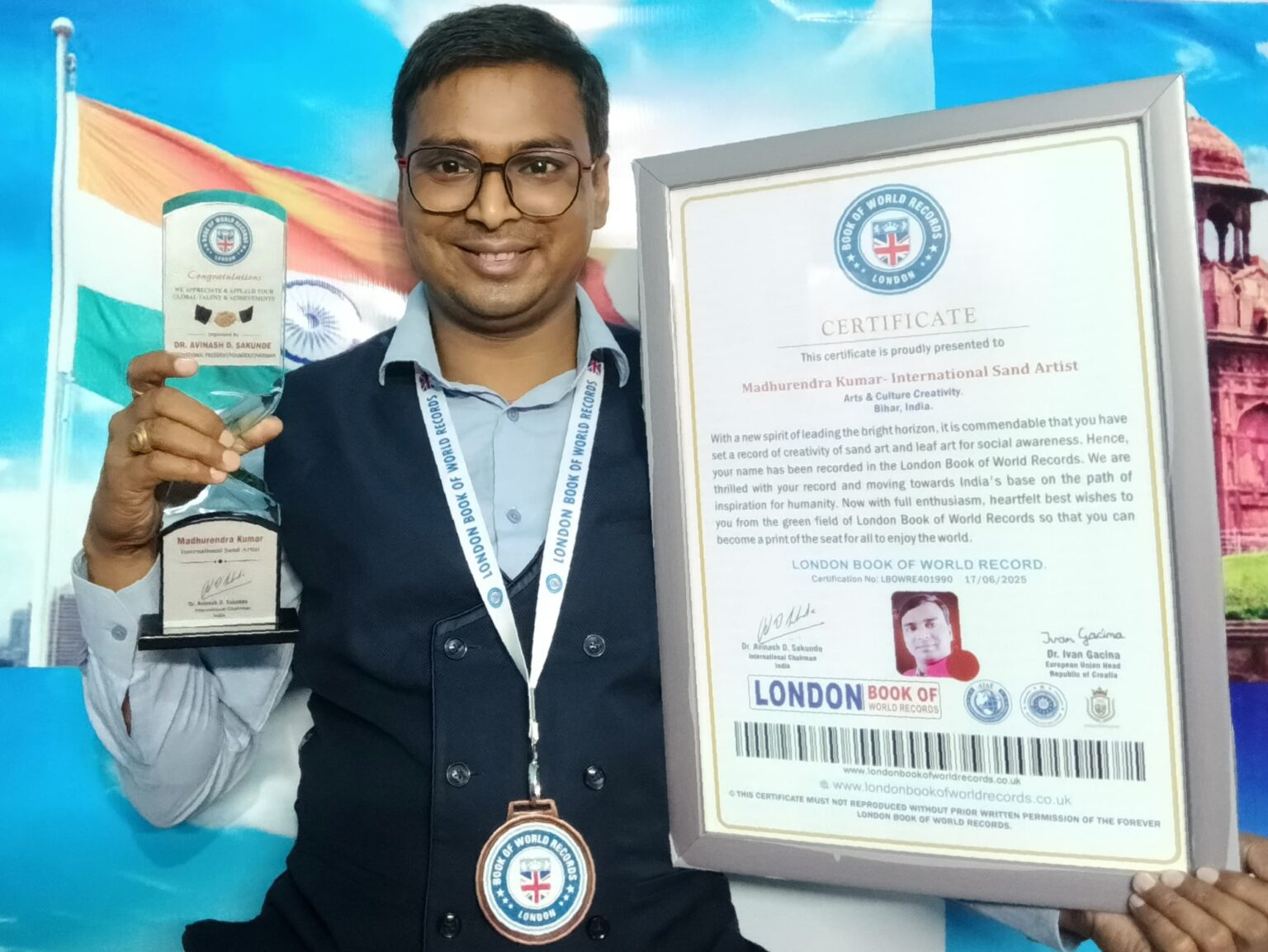 31 वर्षीय सैंड आर्टिस्ट मधुरेंद्र कुमार को यह सम्मान ब्रिटिश पार्लियामेंट लंदन में आयोजित एक समारोह के दौरान दिया गया। समारोह में लंदन बुक ऑफ वर्ल्ड रिकॉर्ड के अंतर्राष्ट्रीय अध्यक्ष डॉ अविनाश डी सकुंडे व यूरोपीय संघ के प्रमुख डॉ इवान गैसीना ने संयुक्त रूप से उन्हे प्रशस्ति पत्र, स्मृति चिन्ह, अंगवस्त्र के साथ मैडल पहनाकर सम्मानित किया।