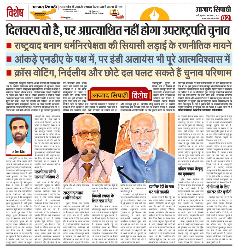 उपराष्ट्रपति के चुनाव के लिए अब नौ सितंबर को मतदान होना तय है। एनडीए उम्मीदवार सीपी राधाकृष्णन के मुकाबले इंडिया गठबंधन ने जस्टिस बी सुदर्शन रेड्डी को मैदान में उतारा है। दोनों ने नामांकन दाखिल भी कर दिया है। दोनों गठबंधन अपनी रणनीतियों को अंतिम रूप देने में लगे हैं। इंडिया गठबंधन ने जैसे ही अपना उम्मीदवार खड़ा किया, एनडीए ने अपनी रणनीति में बदलाव लाना शुरू कर दिया। अभी तक एनडीए की कोशिश थी कि उसके उम्मीदवार सीपी राधाकृष्णन के नाम पर आम सहमति बन जाये। इसके लिए राजनाथ सिंह विपक्ष के नेताओं से बात भी कर रहे थे। लेकिन बात नहीं बनी और इंडी अलायंस ने पूर्व जज बी सुदर्शन रेड्डी को प्रत्याशी बना दिया। इसके बाद एनडीए अब इस कोशिश में है कि सीपी राधाकृष्णन को ज्यादा से ज्यादा वोट मिले। इसके लिए वह इंडी गठबंधन के कुछ घटक दलों को अपने पाले में करने की कोशिश में है। उधर इंडी गठबंधन ने तेलंगाना से प्रत्याशी देकर एनडीए में सेंध लगाने की रणनीति तैयार की है, लेकिन यह कामयाब होगी, ऐसा फिलहाल तो लगता नहीं है। उपराष्ट्रपति चुनाव में संख्या बल के हिसाब से एनडीए मजबूत स्थिति में है। एनडीए ने वाइएसआर कांग्रेस पार्टी का समर्थन हासिल कर लिया है, जिससे उनकी स्थिति और मजबूत हुई है। हालांकि बीजू जनता दल ने एनडीए उम्मीदवार को समर्थन नहीं देने का फैसला किया है, जिससे गठबंधन को अपनी रणनीति को और पुख्ता करने की जरूरत है। उधर इंडी गठबंधन को पता है कि एनडीए के पास संख्या बल है, फिर भी वह इस चुनाव को एक मजबूत राजनीतिक संदेश देने के अवसर के रूप में देख रहा है। बी सुदर्शन रेड्डी के चयन से गठबंधन की कोशिश है कि वह बीजेपी के कुछ असंतुष्ट सांसदों या सहयोगी दलों को क्रॉस-वोटिंग के लिए प्रेरित करे। गठबंधन निर्दलीय सांसदों, बीजद और अन्य छोटे दलों से समर्थन जुटाने में लगा है। उपराष्ट्रपति का चुनाव इस बार राष्ट्रवाद बनाम धर्मनिरपेक्षता का चोला ओढ़ चुका है। क्या है इसके पीछे की सियासी रणनीति और राष्ट्रीय राजनीति में इसका क्या हो सकता है असर, बता रहे हैं आजाद सिपाही के विशेष संवाददाता राकेश सिंह।