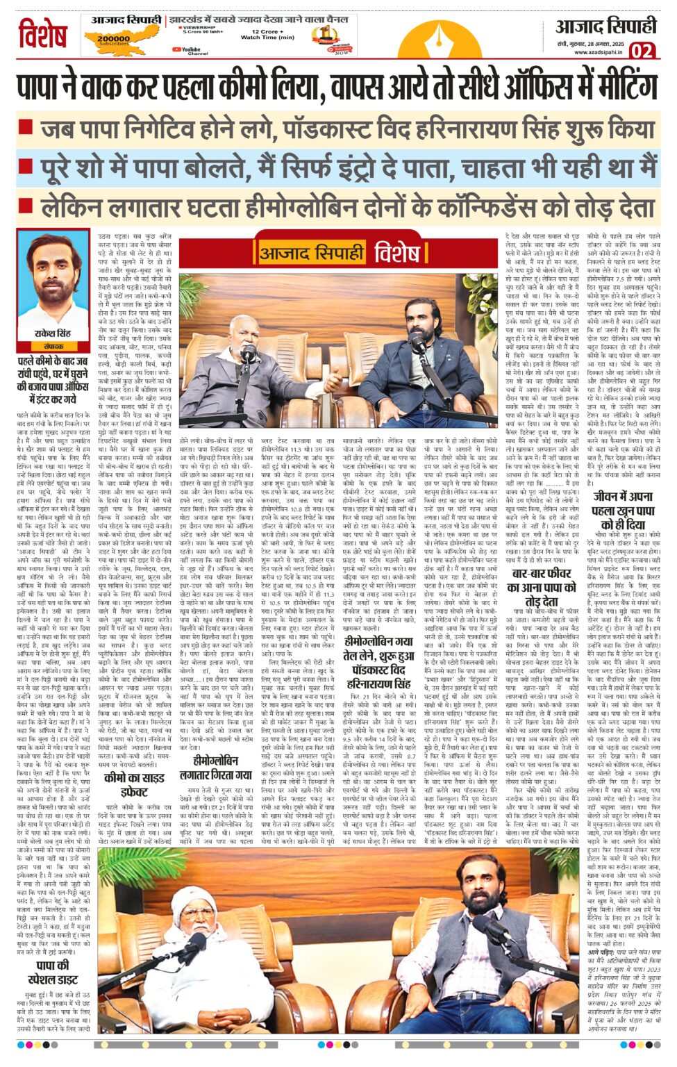 फिर 21 दिन बीतने को थे। तीसरे कीमो की बारी आ गयी। दूसरे कीमो के बाद पापा का हीमोग्लोबिन और तेजी से घटा। दूसरे कीमो के एक हफ्ते के बाद 9.5 और करीब 14 दिनों के बाद, तीसरे कीमो के लिए, जाने से पहले जो जांच करायी, उसमे 8.7 हीमोग्लोबिन हो गया। लेकिन पापा को बहुत कमजोरी महसूस नहीं हो रही थी। वह आराम से चल कर एयरपोर्ट भी गये और दिल्ली के एयरपोर्ट पर भी व्हील चेयर लेने की जरूरत नहीं पड़ी। दिल्ली का एयरपोर्ट काफी बड़ा है और चलना भी बहुत पड़ता है। लेकिन वहां कम चलना पड़े, उसके लिये भी, कई साधन मौजूद हैं। लेकिन पापा वाक कर के ही जाते। तीसरा कीमो भी पापा ने आसानी से लिया। लेकिन तीसरे कीमो के बाद जब हम घर आये तो कुछ दिनों के बाद पापा की हफनी बढ़ने लगी। अब छत पर चढ़ने से पापा को दिक्कत महसूस होती। लेकिन रुक-रुक कर किसी तरह वह छत पर चढ़ जाते। उन्हें छत पर घंटों रहना अच्छा लगता। वहीं मैं पापा का मसाज भी करता, नहला भी देता और पापा सो भी जाते। एक कमरा था छत पर भी। लेकिन हीमोग्लोबिन का घटना पापा के कॉन्फिडेंस को तोड़ रहा था। पापा कहते हीमोग्लोबिन घटना ठीक नहीं है। मैं कहता पापा अभी कीमो चल रहा है, हीमोग्लोबिन घटता है। एक बार जब कीमो बंद होगा सब फिर से बेहतर हो जायेगा। तीसरे कीमो के बाद से पापा ज्यादा सोचने लगे थे। कभी-कभी नेगेटिव भी हो जाते। फिर मुझे आइडिया आया कि पापा में ऊर्जा भरनी हो तो, उनसे पत्रकारिता की बात की जाये। मैंने एक शो डिजाइन किया। पापा से पत्रकारिता के दौर की स्टोरी निकलवायी जाये। मैंने उनसे कहा कि पापा जब आप ‘प्रभात खबर’ और ‘हिंदुस्तान’ में थे, उस दौरान झारखंड में कई सारी घटनाएं हुई थीं और आप उसके साक्षी भी थे। मुझे लगता है, इसपर शो करना चाहिए। ‘पॉडकास्ट विद हरिनारायण सिंह’ शुरू करते हैं। पापा उत्साहित हुए। बोले सही बोल रहे हो। पापा ने कहा एक-दो दिन मुझे दो, मैं तैयारी कर लेता हूं। पापा ने फिर से ऑफिस में बैठना शुरू किया। पापा ऊर्जा से लैस। हीमोग्लोबिन गया भांड़ में। दो दिन के बाद पापा तैयार थे। बोले शूट नहीं करोगे क्या पॉडकास्ट। मैंने कहा बिलकुल। मैंने पूरा सेटअप तैयार कर रखा था। उसी प्लान के साथ मैं आगे बढ़ा। पहला पॉडकास्ट शूट हुआ। नाम दिया ‘पॉडकास्ट विद हरिनारायण सिंह’। मैं शो के टॉपिक के बारे में इंट्रो तो दे देता और पहला सवाल भी पूछ लेता, उसके बाद पापा नॉन स्टॉप फ्लो में बोले जाते। मुझे मन में हंसी भी आती, मैं मन ही मन कहता, अरे पापा मुझे भी बोलने दीजिये, मैं शो का होस्ट हूं। लेकिन पापा कहां चुप रहने वाले थे और यही तो मैं चाहता भी था। गिन के एक-दो सवाल ही कर पाता। उसके बाद पूरा मंच पापा का। वैसे भी घटना उनके सामने हुई थी, सब उन्हें ही पता था। जब सारा मटेरियल वह खुद ही दे रहे थे, तो मैं बीच में फ्लो क्यों खरा