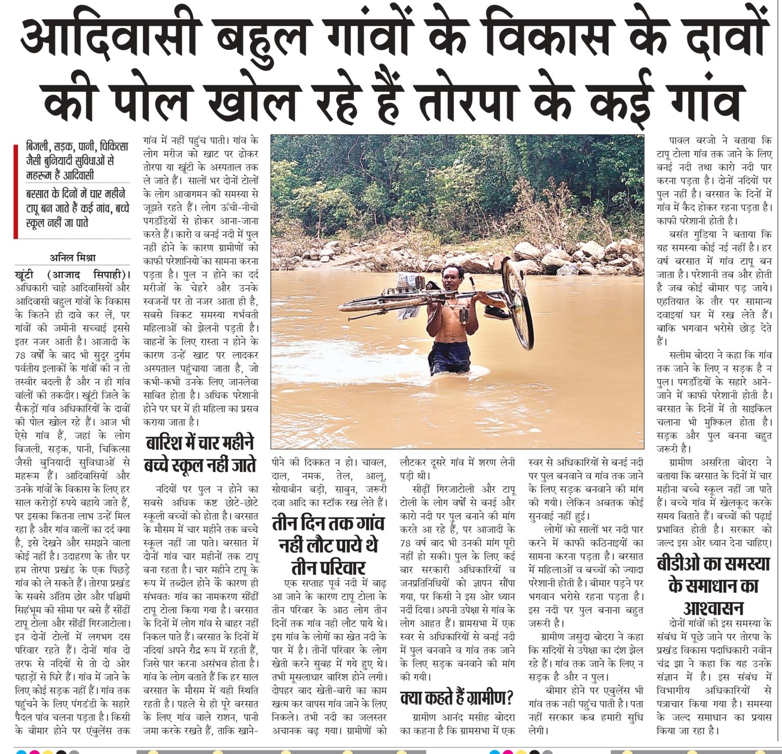 खूंटी। अधिकारी चाहे आदिवासियों और आदिवासी बहुल गांवों के विकास के कितने ही दावे कर लें, पर गांवों की जमीनी सच्चाई इससे इतर नजर आती है। आजादी के 78 वर्षों के बाद भी सुदूर दुर्गम पर्वतीय इलाकों के गांवों की न तो तस्वीर बदली है और न ही गांव वांलों की तकदीर। खूंटी जिले के सैकड़ों गांव अधिकारियों के दावों की पोल खोल रहे हैं। आज भी ऐसे गांव हैं, जहां के लोग बिजली, सड़क, पानी, चिकित्सा जैसी बुनियादी सुविधाओं से महरूम हैं। आदिवासियों और उनके गांवों के विकास के लिए हर साल करोड़ों रुपये बहाये जाते हैं, पर इसका कितना लाभ उन्हें मिल रहा है और गांव वालों का दर्द क्या है, इसे देखने और समझने वाला कोई नहीं है। उदाहरण के तौर पर हम तोरपा प्रखंड के एक पिछड़े गांव को ले सकते हैं। तोरपा प्रखंड के सबसे अंतिम छोर और पश्चिमी सिहंभूम की सीमा पर बसे हैं सींढीं टापू टोला और सींढीं गिरजाटोला। इन दोनों टोलों में लगभग दस परिवार रहते हैं। दोनों गांव दो तरफ से नदियों से तो दो ओर पहाड़ों से घिरे हैं। गांव में जाने के लिए कोई सड़क नहीं हैं। गांव तक पहुंचने के लिए पंगडंडी के सहारे पैदल पांव चलना पड़ता है। किसी के बीमार होने पर एंबुलेंस तक गांव में नहीं पहुंच पाती। गांव के लोग मरीज को खाट पर ढोकर तोरपा या खूंटी के अस्पताल तक ले जाते हैं। सालों भर दोनों टोलों के लोग आवागमन की समस्या से जूझते रहते हैं। लोग ऊंची-नीची पगडंडियों से होकर आना-जाना करते हैं। कारो व बनई नदी में पुल नहीं होने के कारण ग्रामीणों को काफी परेशानियो ंका सामना करना पड़ता है। पुल न होने का दर्द मरीजों के चेहरे और उनके स्वजनों पर तो नजर आता ही है, सबसे विकट समस्या गर्भवती महिलाओं को झेलनी पड़ती है। वाहनों के लिए रास्ता न होने के कारण उन्हें खाट पर लादकर अस्पताल पहुंचाया जाता है, जो कभी-कभी उनके लिए जानलेवा साबित होता है। अधिक परेशानी होने पर घर में ही महिला का प्रसव कराया जाता है।