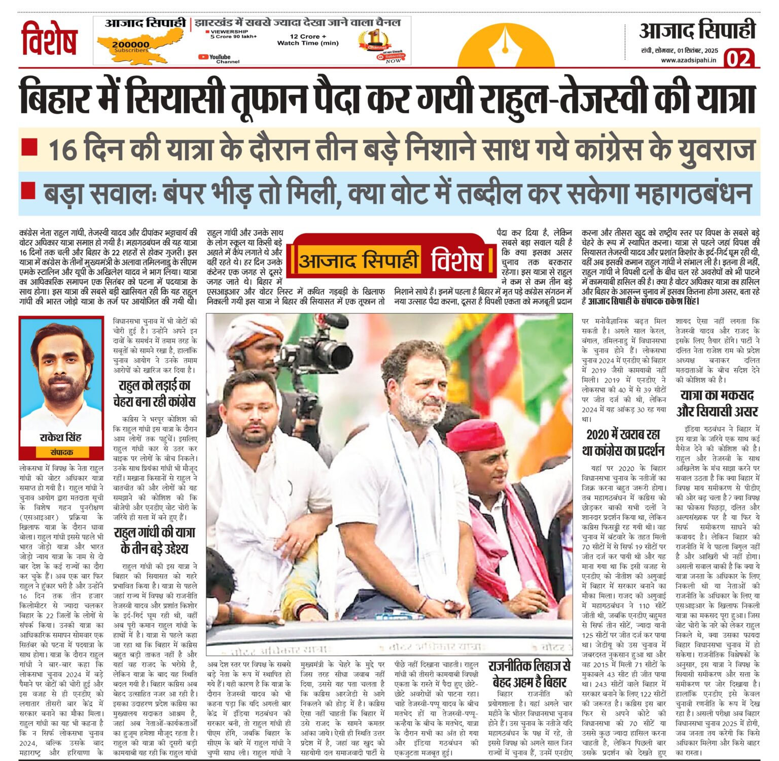 कांग्रेस नेता राहुल गांधी, तेजस्वी यादव और दीपांकर भट्टाचार्य की वोटर अधिकार यात्रा समाप्त हो गयी है। महागठबंधन की यह यात्रा 16 दिनों तक चली और बिहार के 22 शहरों से होकर गुजरी। इस यात्रा में कांग्रेस के तीनों मुख्यमंत्री के अलावा तमिलनाडु के सीएम एमके स्टालिन और यूपी के अखिलेश यादव ने भाग लिया। यात्रा का आधिकारिक समापन एक सितंबर को पटना में पदयात्रा के साथ होगा। इस यात्रा की सबसे बड़ी खासियत रही कि यह राहुल गांधी की भारत जोड़ो यात्रा के तर्ज पर आयोजित की गयी थी। राहुल गांधी और उनके साथ के लोग स्कूल या किसी बड़े अहाते में कैंप लगाते थे और वहीं रहते थे। हर दिन उनके कंटेनर एक जगह से दूसरे जगह जाते थे। बिहार में एसआइआर और वोटर लिस्ट में कथित गड़बड़ी के खिलाफ निकाली गयी इस यात्रा ने बिहार की सियासत में एक तूफान तो पैदा कर दिया है, लेकिन सबसे बड़ा सवाल यही है कि क्या इसका असर चुनाव तक बरकरार रहेगा। इस यात्रा से राहुल ने कम से कम तीन बड़े निशाने साधे हैं। इनमें पहला है बिहार में मृत पड़े कांग्रेस संगठन में नया उत्साह पैदा करना, दूसरा है विपक्षी एकता को मजबूती प्रदान करना और तीसरा खुद को राष्ट्रीय स्तर पर विपक्ष के सबसे बड़े चेहरे के रूप में स्थापित करना। यात्रा से पहले जहां विपक्ष की सियासत तेजस्वी यादव और प्रशांत किशोर के इर्द-गिर्द घूम रही थी, वहीं अब इसकी कमान राहुल गांधी ने संभाल ली है। इतना ही नहीं, राहुल गांधी ने विपक्षी दलों के बीच चल रहे अवरोधों को भी पाटने में कामयाबी हासिल की है। क्या है वोटर अधिकार यात्रा का हासिल और बिहार के आसन्न चुनाव में इसका कितना होगा असर, बता रहे हैं आजाद सिपाही के संपादक राकेश सिंह।
