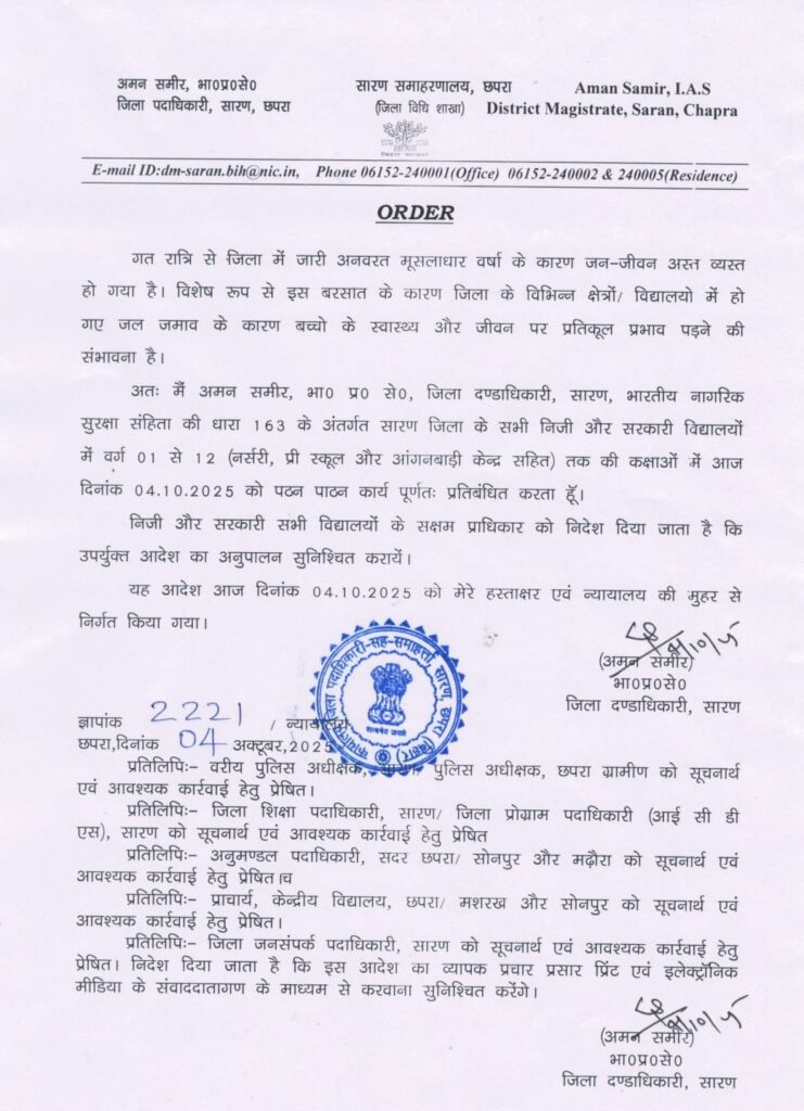 छपरा। सारण जिला में रात्रि से जारी मूसलाधार बारिश से आम जनजीवन प्रभावित हुआ है। बारिश के कारण सड़कों पर बाढ़ जैसे हालात हैं। जिसे लेकर सुरक्षा के दृष्टिकोण से एहतियात बरतते हुये जिला दंडाधिकारी सह जिलाधिकारी अमन समीर द्वारा जिला के सभी विद्यालयों एवं आंगनबाड़ी केंद्रों को आज शनिवार के लिये बंद रखने का आदेश दिया गया है.