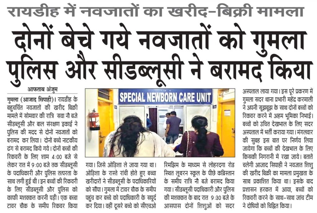 • रायडीह में नवजातों का खरीद-बिक्री मामला: दोनों बेचे गये नवजातों को गुमला पुलिस और सीडब्लूसी ने बरामद किया