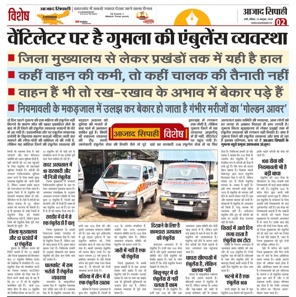 दो दिन पहले गुमला की एक महिला की एंबुलेंस नहीं मिलने के कारण मौत की खबर प्रकाशित होने के बाद से ही जिले की एंबुलेंस व्यवस्था सवालों के घेरे में आ गयी है। प्रशासनिक तौर पर एंबुलेंस संचालक एजेंसी के खिलाफ कारण बताओ नोटिस जारी कर मामले की लीपा-पोती की कोशिश तो की गयी है, लेकिन यह कोशिश जिले की एंबुलेंस व्यवस्था की बदहाल अवस्था को दुनिया की नजरों से बचा पाने में असफल साबित हुई है। किसी भी स्वास्थ्य व्यवस्था की रीढ़ मानी जानेवाली एंबुलेंस सेवा की स्थिति वैसे तो पूरे झारखंड में लगभग एक जैसी है, लेकिन गुमला जिले में यह व्यवस्था आइसीयू में ही नहीं, वेंटिलेटर पर पहुंच गयी है। चाहे वह सरकारी 108 एंबुलेंस सेवा हो या फिर अस्पताल प्रबंध समिति की व्यवस्था, आम लोगों को हर जगह से अक्सर निराशा ही हाथ लगती है। गुमला जिला मुख्यालय से लेकर प्रखंडों तक में एंबुलेंस व्यवस्था की लगभग यही स्थिति है। क्या है गुमला जिले की एंबुलेंस व्यवस्था और क्या हो रहा है इसका परिणाम, बता रहे हैं आजाद सिपाही के गुमला ब्यूरो प्रमुख आफताब अंजुम।