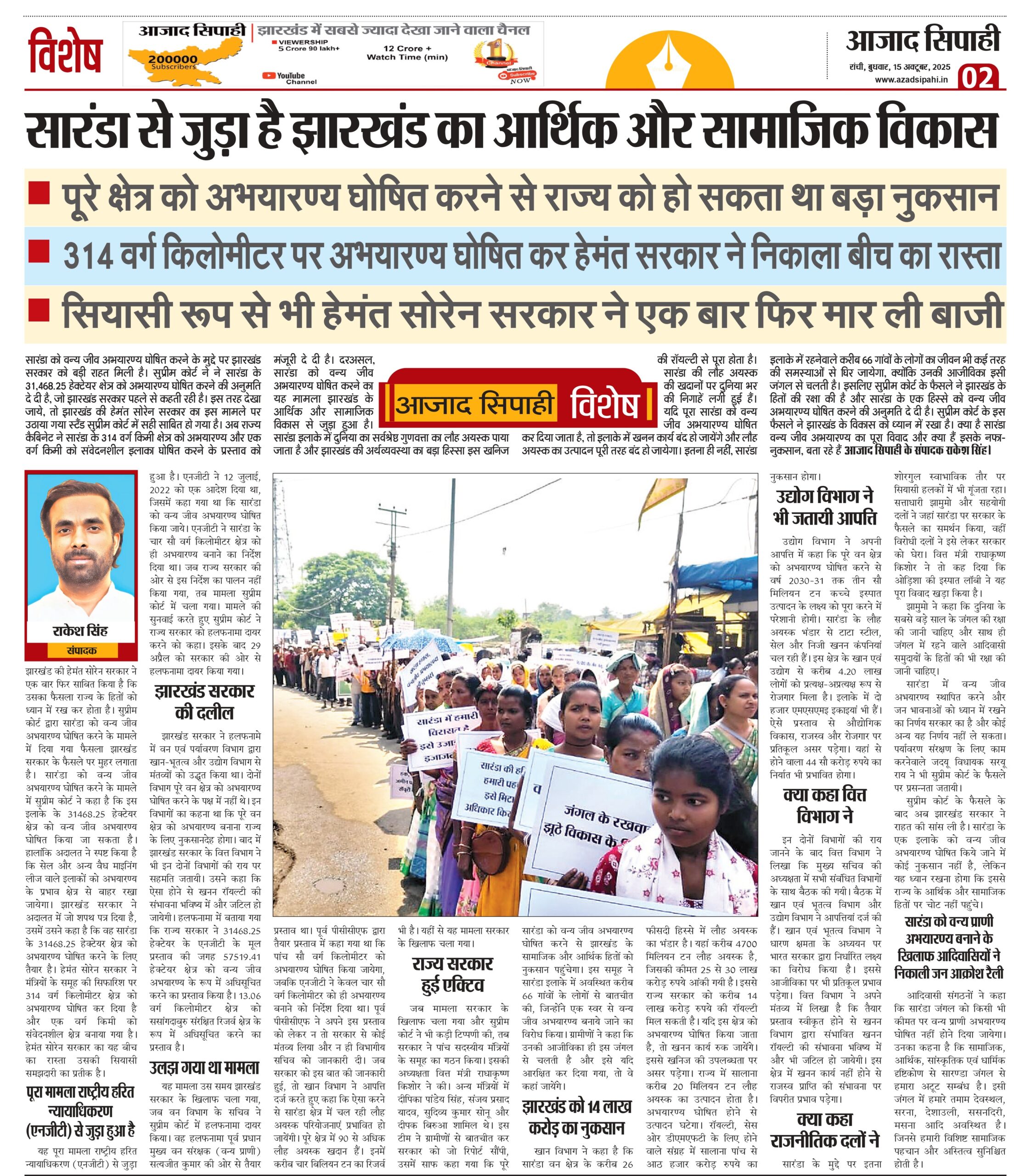 सारंडा को वन्य जीव अभयारण्य घोषित करने के मुद्दे पर झारखंड सरकार को बड़ी राहत मिली है। सुप्रीम कोर्ट ने ने सारंडा के 31,468.25 हेक्टेयर क्षेत्र को अभयारण्य घोषित करने की अनुमति दे दी है, जो झारखंड सरकार पहले से कहती रही है। इस तरह देखा जाये, तो झारखंड की हेमंत सोरेन सरकार का इस मामले पर उठाया गया स्टैंड सुप्रीम कोर्ट में सही साबित हो गया है। अब राज्य कैबिनेट ने सारंडा के 314 वर्ग किमी क्षेत्र को अभयारण्य और एक वर्ग किमी को संवेदनशील इलाका घोषित करने के प्रस्ताव को मंजूरी दे दी है। दरअसल, सारंडा को वन्य जीव अभयारण्य घोषित करने का यह मामला झारखंड के आर्थिक और सामाजिक विकास से जुड़ा हुआ है। सारंडा इलाके में दुनिया का सर्वश्रेष्ठ गुणवत्ता का लौह अयस्क पाया जाता है और झारखंड की अर्थव्यवस्था का बड़ा हिस्सा इस खनिज की रॉयल्टी से पूरा होता है। सारंडा की लौह अयस्क की खदानों पर दुनिया भर की निगाहें लगी हुई हैं। यदि पूरा सारंडा को वन्य जीव अभयारण्य घोषित कर दिया जाता है, तो इलाके में खनन कार्य बंद हो जायेंगे और लौह अयस्क का उत्पादन पूरी तरह बंद हो जायेगा। इतना ही नहीं, सारंडा इलाके में रहनेवाले करीब 66 गांवों के लोगों का जीवन भी कई तरह की समस्याओं से घिर जायेगा, क्योंकि उनकी आजीविका इसी जंगल से चलती है। इसलिए सुप्रीम कोर्ट के फैसले ने झारखंड के हितों की रक्षा की है और सारंडा के एक हिस्से को वन्य जीव अभयारण्य घोषित करने की अनुमति दे दी है। सुप्रीम कोर्ट के इस फैसले ने झारखंड के विकास को ध्यान में रखा है। क्या है सारंडा वन्य जीव अभयारण्य का पूरा विवाद और क्या हैं इसके नफा-नुकसान, बता रहे हैं आजाद सिपाही के संपादक राकेश सिंह।