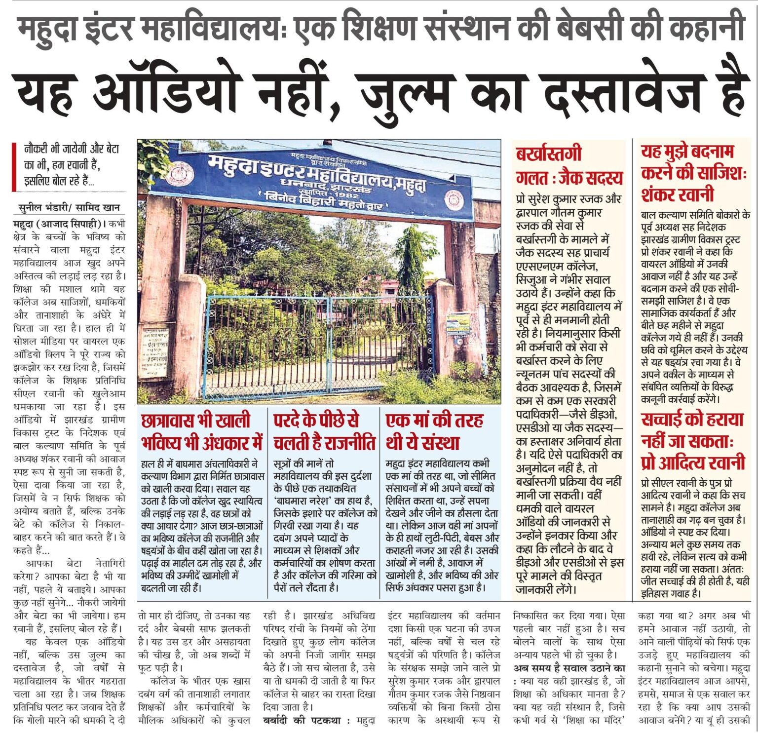 महुदा। कभी क्षेत्र के बच्चों के भविष्य को संवारने वाला महुदा इंटर महाविद्यालय आज खुद अपने अस्तित्व की लड़ाई लड़ रहा है। शिक्षा की मशाल थामे यह कॉलेज अब साजिशों, धमकियों और तानाशाही के अंधेरे में घिरता जा रहा है। हाल ही में सोशल मीडिया पर वायरल एक ऑडियो क्लिप ने पूरे राज्य को झकझोर कर रख दिया है, जिसमें कॉलेज के शिक्षक प्रतिनिधि सीएल रवानी को खुलेआम धमकाया जा रहा है। इस ऑडियो में झारखंड ग्रामीण विकास ट्रस्ट के निदेशक एवं बाल कल्याण समिति के पूर्व अध्यक्ष शंकर रवानी की आवाज स्पष्ट रूप से सुनी जा सकती है, ऐसा दावा किया जा रहा है, जिसमें वे न सिर्फ शिक्षक को अयोग्य बताते हैं, बल्कि उनके बेटे को कॉलेज से निकाल-बाहर करने की बात करते हैं। वे कहते हैं…