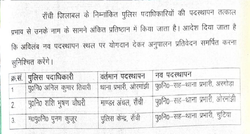 इसके अलावा, शशिभूषण चौधरी को ओरमांझी थाना की कमान सौंपी गई है। वे इससे पहले मांडर अंचल में अपनी सेवाएं दे रहे थे। इसी क्रम में, पूनम कुजूर को पुलिस केंद्र से स्थानांतरित कर चुटिया थाना प्रभारी बनाया गया है।