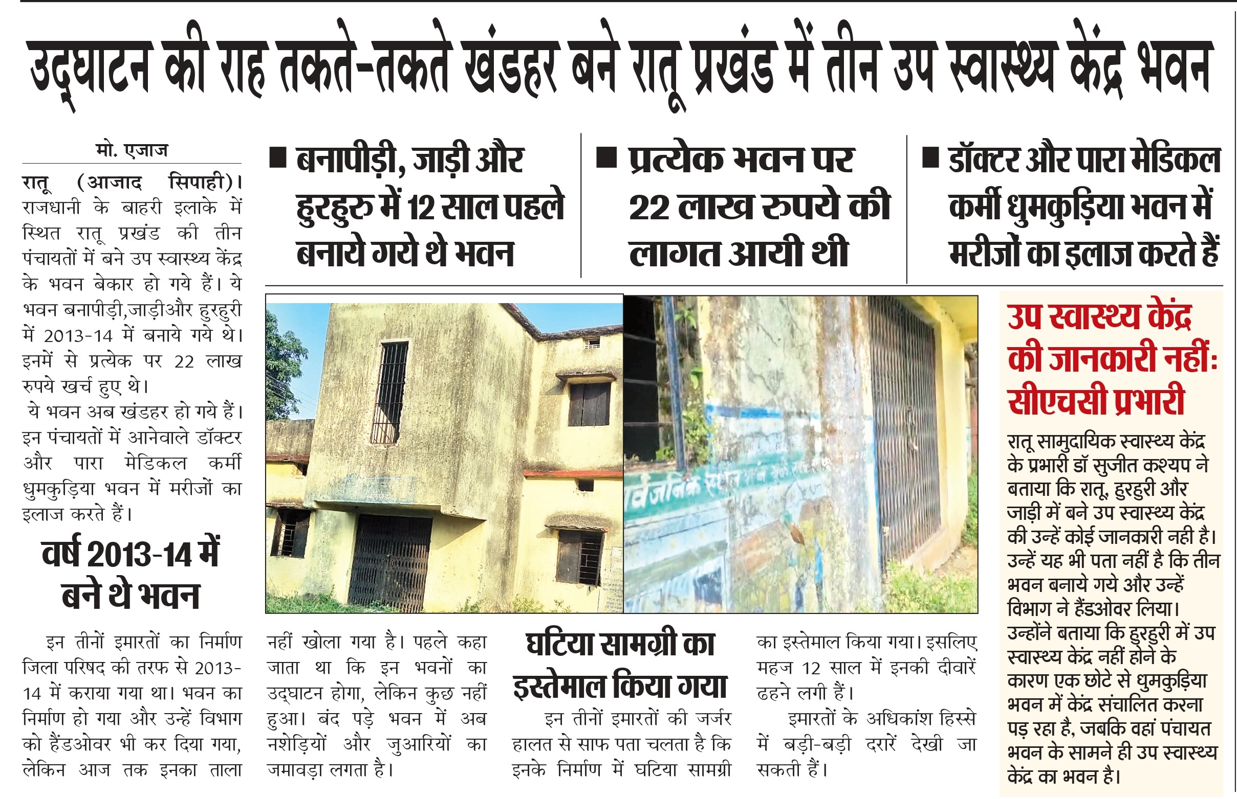 रातू। राजधानी के बाहरी इलाके में स्थित रातू प्रखंड की तीन पंचायतों में बने उप स्वास्थ्य केंद्र के भवन बेकार हो गये हैं। ये भवन बनापीड़ी,जाड़ीऔर हुरहुरी में 2013-14 में बनाये गये थे। इनमें से प्रत्येक पर 22 लाख रुपये खर्च हुए थे। ये भवन अब खंडहर हो गये हैं। इन पंचायतों में आनेवाले डॉक्टर और पारा मेडिकल कर्मी धुमकुड़िया भवन में मरीजों का इलाज करते हैं।