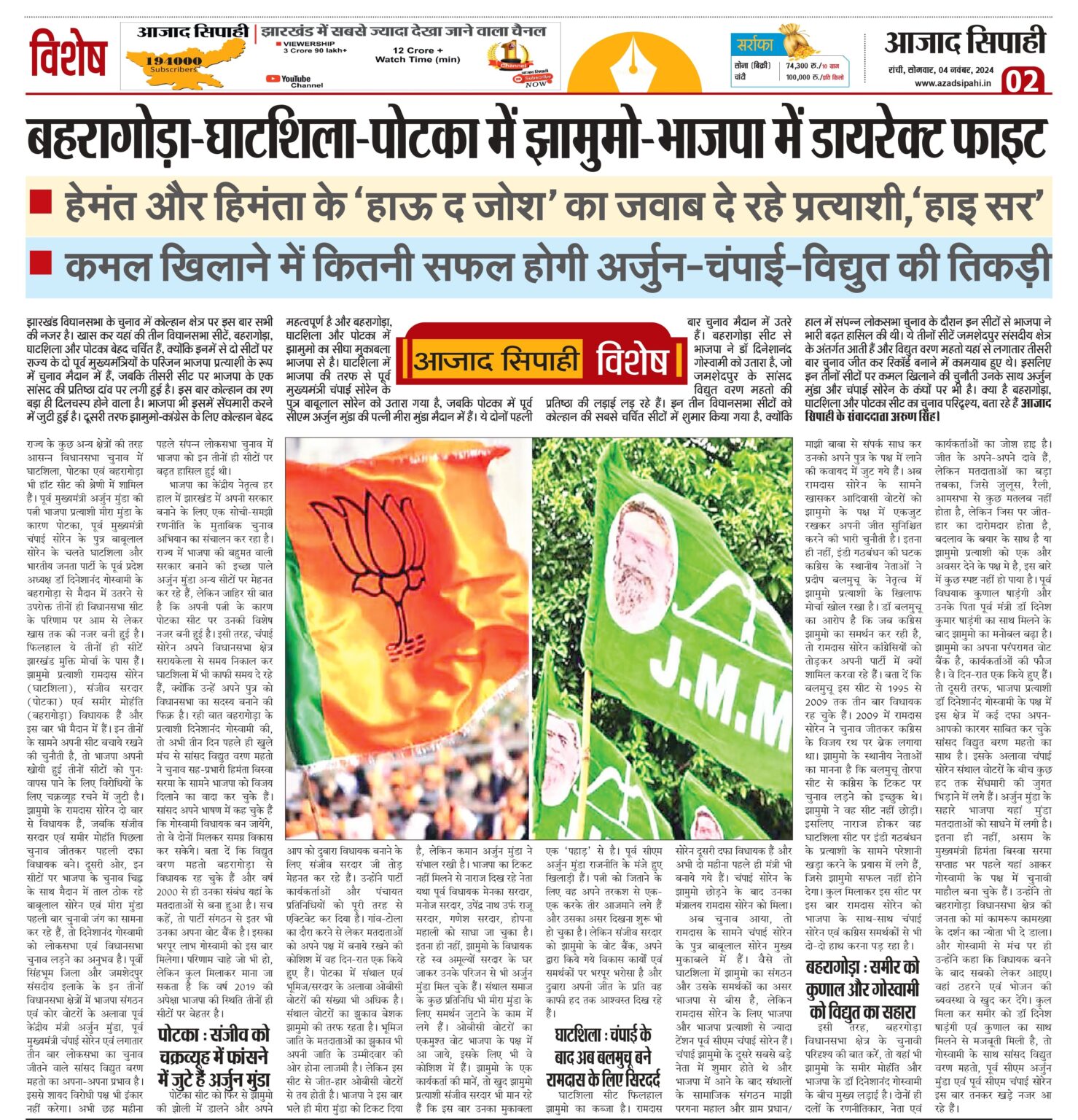 भाजपा का केंद्रीय नेतृत्व हर हाल में झारखंड में अपनी सरकार बनाने के लिए एक सोची-समझी रणनीति के मुताबिक चुनाव अभियान का संचालन कर रहा है। राज्य में भाजपा की बहुमत वाली सरकार बनाने की इच्छा पाले अर्जुन मुंडा अन्य सीटों पर मेहनत कर रहे हैं, लेकिन जाहिर सी बात है कि अपनी पत्नी के कारण पोटका सीट पर उनकी विशेष नजर बनी हुई है। इसी तरह, चंपाई सोरेन अपने विधानसभा क्षेत्र सरायकेला से समय निकाल कर घाटशिला में भी काफी समय दे रहे हैं, क्योंकि उन्हें अपने पुत्र को विधानसभा का सदस्य बनाने की फिक्र है। रही बात बहरागोड़ा के प्रत्याशी दिनेशानंद गोस्वामी की, तो अभी तीन दिन पहले ही खुले मंच से सांसद विद्युत वरण महतो ने चुनाव सह-प्रभारी हिमंता बिस्वा सरमा के सामने भाजपा को विजय दिलाने का वादा कर चुके हैं। सांसद अपने भाषण में कह चुके हैं कि गोस्वामी विधायक बन जायेंगे, तो वे दोनों मिलकर समग्र विकास कर सकेंगे। बता दें कि विद्युत वरण महतो बहरागोड़ा से विधायक रह चुके हैं और वर्ष 2000 से ही उनका संबंध यहां के मतदाताओं से बना हुआ है। सच कहें, तो पार्टी संगठन से इतर भी उनका अपना वोट बैंक है। इसका भरपूर लाभ गोस्वामी को इस बार मिलेगा। परिणाम चाहे जो भी हो, लेकिन कुल मिलाकर माना जा सकता है कि वर्ष 2019 की अपेक्षा भाजपा की स्थिति तीनों ही सीटों पर बेहतर है।