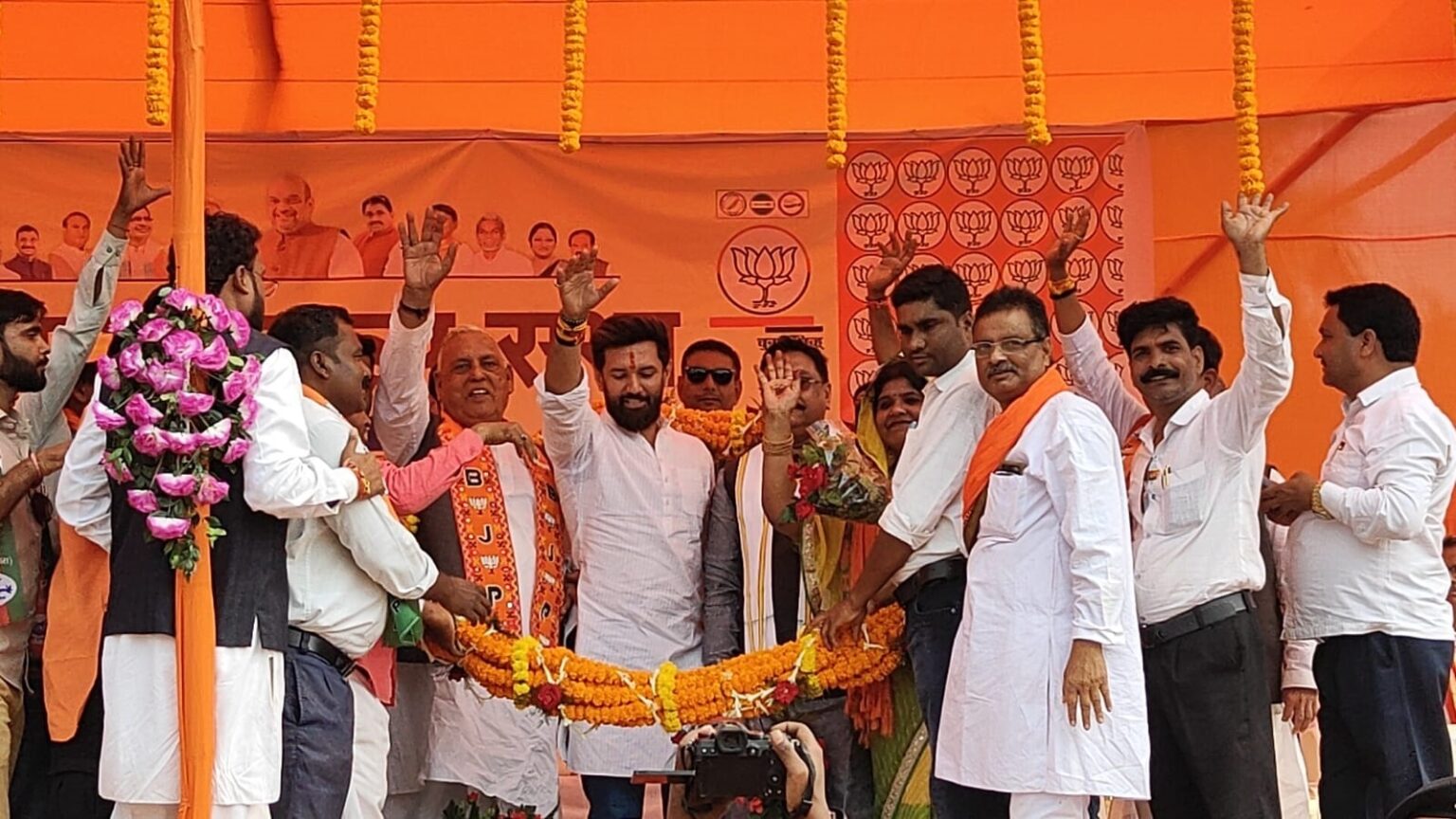 चिराग ने कहा कि लोकसभा चुनाव से पहले इसी तरह का माहौल बनाने की कोशिश की गयी लेकिन मैं आपसे पूछना चाहता हूं कि लोस चुनाव के साढ़े पांच महीने बीतने के बाद भी क्या आरक्षण खत्म हो गया या संविधान पर किसी तरह का खतरा उत्पन्न हुआ। इस बुने हुए मायाजाल को समझने की जरूरत है। उन्होंने कहा कि प्रधानमंत्री जनकल्याण योजना उनके पिता रामविलास पासवान और प्रधानमंत्री नरेन्द्र मोदी की देन है। आज इस योजना से 80 करोड़ लोग मुफ्त में राशन उठाते हैं। मोबाइल फोन भी उनके पिता की देन है। चिराग पासवान ने विश्रामपुर विधानसभा सीट से भाजपा उम्मीदवार रामचन्द्र चन्द्रवंशी एवं हुसैनाबाद विधानसभा क्षेत्र से प्रत्याशी कमलेश कुमार सिंह को जिताने की अपील की।