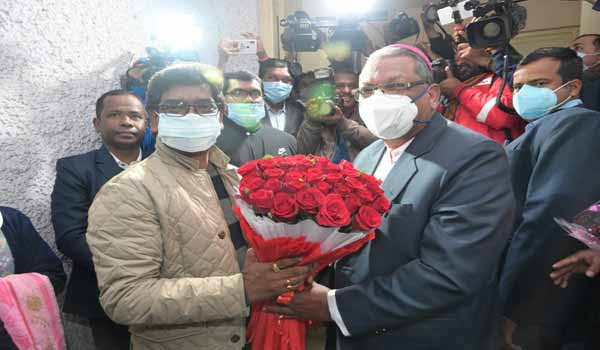 रांची। मुख्यमंत्री हेमन्त सोरेन ने क्रिसमस की पूर्व संध्या पर शुक्रवार को रांची के पुरुलिया रोड स्थित आर्चबिशप हाउस में प्रभु यीशु के दर्शन किए। मुख्यमंत्री एवं आर्चबिशप फेलिक्स टोप्पो ने साथ मिलकर केक काटा। मुख्यमंत्री ने आर्चबिशप फेलिक्स टोप्पो को क्रिसमस की बधाई एवं शुभकामनाएं दीं।