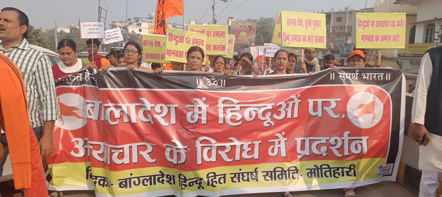 पूर्वी चंपारण। बांग्लादेश में हिन्दूओ पर हो रहे आक्रमण के विरोध में गुरुवार को विहिप सहित विभिन्न हिन्दू संगठनो ने बांग्लादेशी हिन्दू हित संघर्ष समिति के बैनर तले नरसिंह बाबा मंदिर परिसर से विशाल मौन विरोध मार्च निकाला और समाहरणालय पहुंचकर जिलाधिकारी को ज्ञापन सौपा।