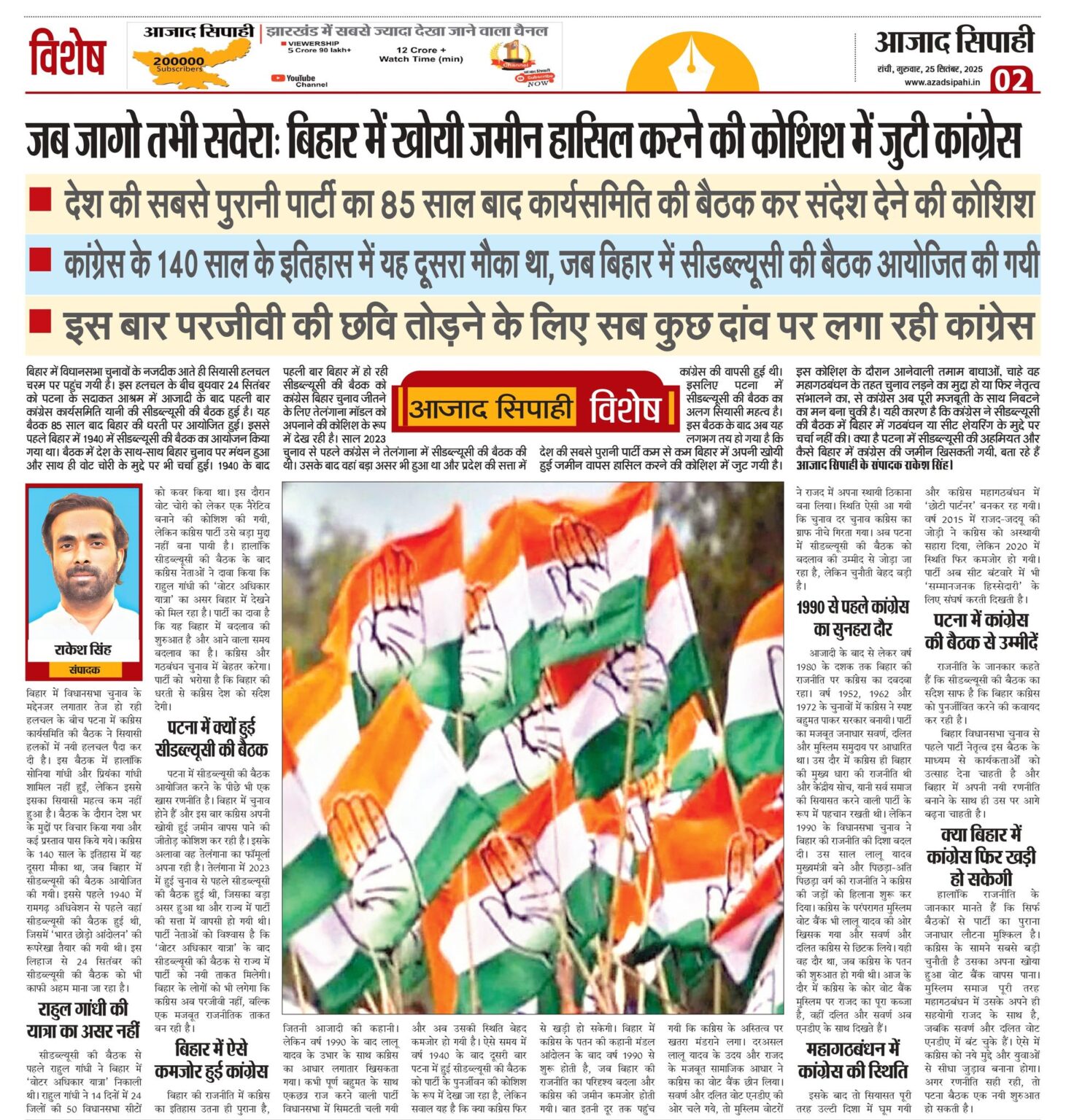 देश की सबसे पुरानी पार्टी का 85 साल बाद कार्यसमिति की बैठक कर संदेश देने की कोशिश -कांग्रेस के 140 साल के इतिहास में यह दूसरा मौका था, जब बिहार में सीडब्ल्यूसी की बैठक आयोजित की गयी -इस बार परजीवी की छवि तोड़ने के लिए सब कुछ दांव पर लगा रही कांग्रेस बिहार में विधानसभा चुनावों के नजदीक आते ही सियासी हलचल चरम पर पहुंच गयी है। इस हलचल के बीच बुधवार 24 सितंबर को पटना के सदाकत आश्रम में आजादी के बाद पहली बार कांग्रेस कार्यसमिति यानी की सीडब्ल्यूसी की बैठक हुई है। यह बैठक 85 साल बाद बिहार…
