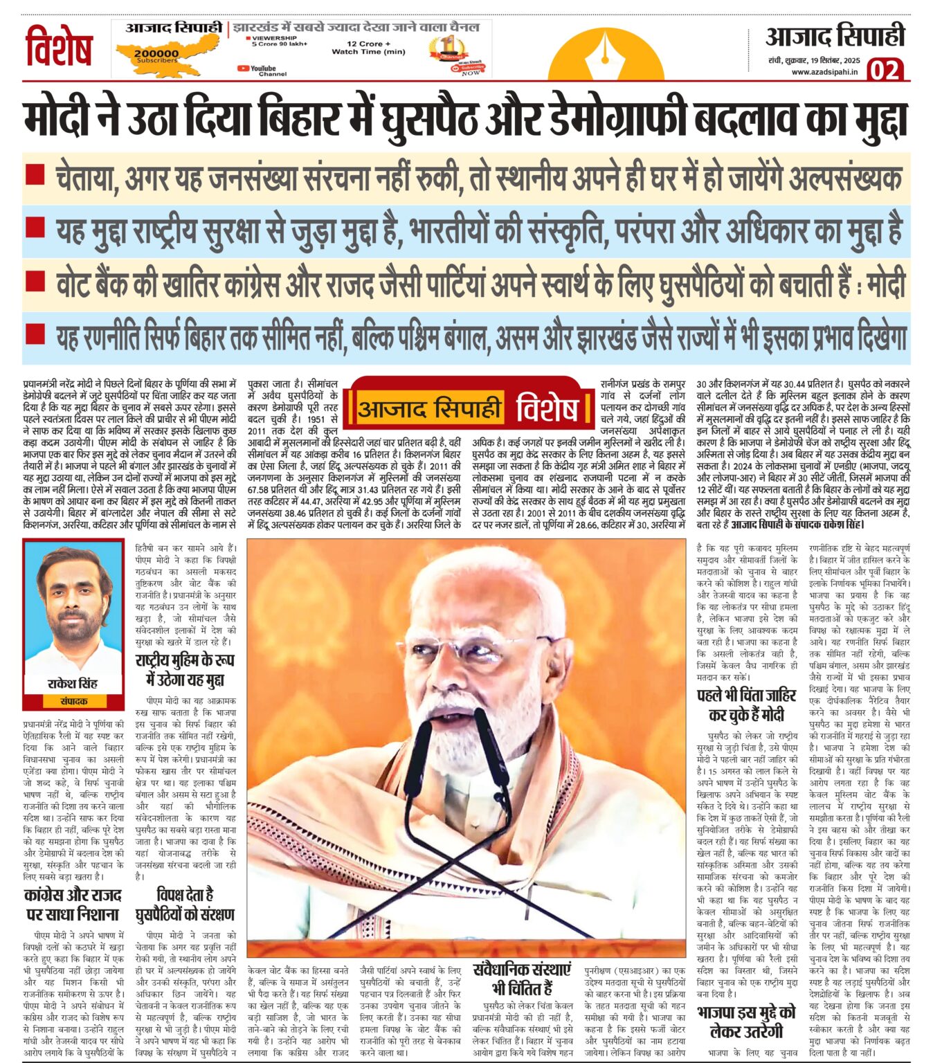 विशेष चेताया अगर यह जनसंख्या संरचना नहीं रुकी, तो स्थानीय अपने ही घर में हो जायेंगे अल्पसंख्यक यह मुद्दा राष्ट्रीय सुरक्षा से जुड़ा मुद्दा है, भारतीयों की संस्कृति, परंपरा और अधिकार का मुद्दा है वोट बैंक की खातिर कांग्रेस और राजद जैसी पार्टियां अपने स्वार्थ के लिए घुसपैठियों को बचाती हैं : मोदी यह रणनीति सिर्फ बिहार तक सीमित नहीं, बल्कि पश्चिम बंगाल, असम और झारखंड जैसे राज्यों में भी इसका प्रभाव दिखेगा प्रधानमंत्री नरेंद्र मोदी ने पिछले दिनों बिहार के पूर्णिया की सभा में डेमोग्रेफी बदलने में जुटे घुसपैठियों पर चिंता जाहिर कर यह जता दिया है कि यह…