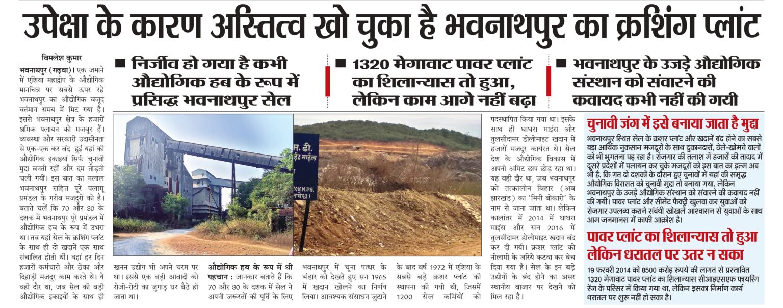 निर्जीव हो गया है कभी औद्योगिक हब के रूप में प्रसिद्ध भवनाथपुर सेल -1320 मेगावाट पावर प्लांट का शिलान्यास तो हुआ, लेकिन काम आगे नहीं बढ़ा -भवनाथपुर के उजड़े औद्योगिक संस्थान को संवारने की कवायद कभी नहीं की गयी विमलेश कुमार भवनाथपुर (गढ़वा)। एक जमाने में एशिया महाद्वीप के औद्योगिक मानचित्र पर सबसे ऊपर रहे भवनाथपुर का औद्योगिक वजूद वर्तमान समय में मिट गया है। इससे भवनाथपुर क्षेत्र के हजारों श्रमिक पलायन को मजबूर हैं। व्यवस्था और सरकारी उदासीनता से एक-एक कर बंद हुईं यहां की औद्योगिक इकाइयां सिर्फ चुनावी मुद्दा बनती रहीं और दम तोड़ती चली गयीं। इस बात…