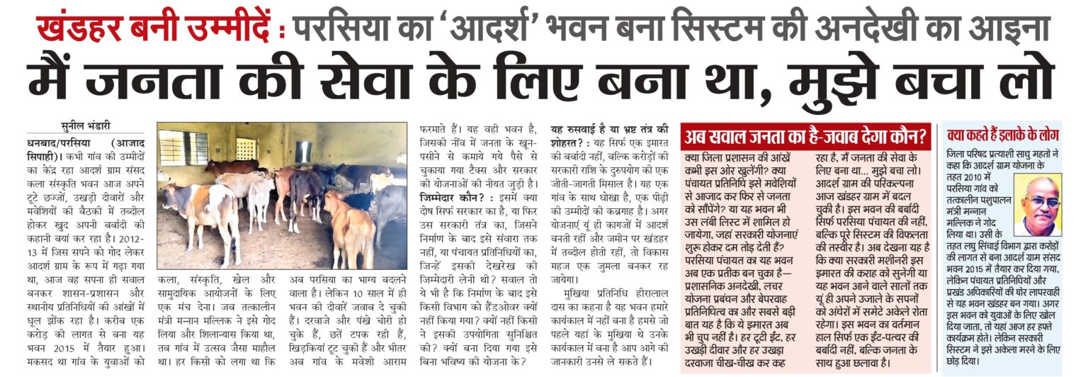 मैं जनता की सेवा के लिए बना था, मुझे बचा लो सुनील भंडारी धनबाद/परसिया। कभी गांव की उम्मीदों का केंद्र रहा आदर्श ग्राम संसद कला संस्कृति भवन आज अपने टूटे छज्जों, उखड़ी दीवारों और मवेशियों की बैठकी में तब्दील होकर खुद अपनी बर्बादी की कहानी बयां कर रहा है। 2012-13 में जिस सपने को गोद लेकर आदर्श ग्राम के रूप में गढ़ा गया था, आज वह सपना ही सवाल बनकर शासन-प्रशासन और स्थानीय प्रतिनिधियों की आंखों में धूल झोंक रहा है। करीब एक करोड़ की लागत से बना यह भवन 2015 में तैयार हुआ। मकसद था गांव के युवाओं को…