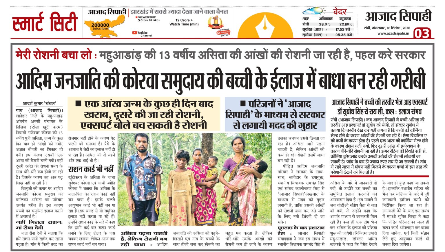महुआडांड़ की 13 वर्षीय असिता की आंखों की रोशनी जा रही है, पहल करे सरकार एक आंख जन्म के कुछ ही दिन बाद खराब, दूसरे की जा रही रोशनी, एक्सपर्ट बोले बच सकती है रोशनी परिजनों ने ‘आजाद सिपाही’ के माध्यम से सरकार से लगायी मदद की गुहार आदर्श कुमार ‘चंचल’ गारु (आजाद सिपाही)। लातेहार जिले के महुआडांड़ अंतर्गत अक्सी पंचायत के तिसिया (टोला खूंटी करम) निवासी राजेश्वर कोरवा की 13 वर्षीय पुत्री असिता, जन्म के कुछ दिन बाद ही आंखों की गंभीर अज्ञात बीमारी का शिकार हो गयी। इस कारण उसकी एक आंख की रोशनी चली गयी। वहीं दूसरी…