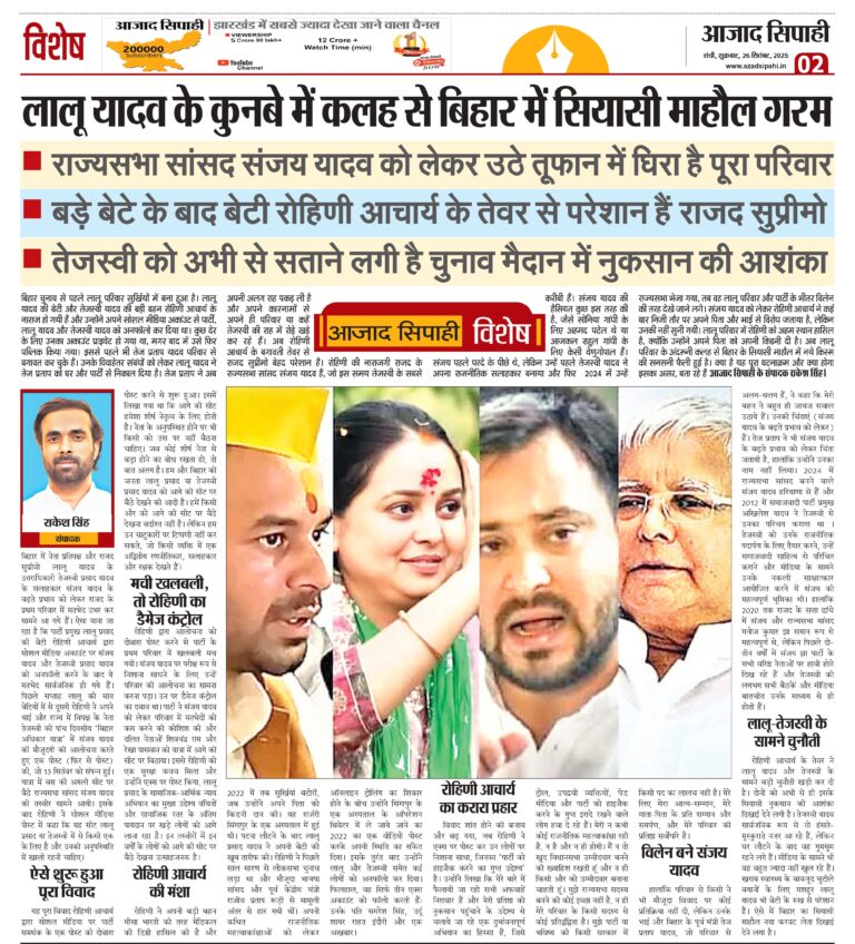 विशेष राज्यसभा सांसद संजय यादव को लेकर उठे तूफान में घिरा है पूरा परिवार बड़े बेटे के बाद बेटी रोहिणी…