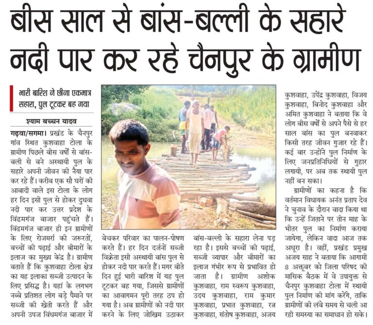 भारी बारिश ने छीना एकमात्र सहारा, पुल टूटकर बह गया श्याम बच्चन यादव गढ़वा/सगमा। प्रखंड के चैनपुर गांव स्थित कुशवाहा…